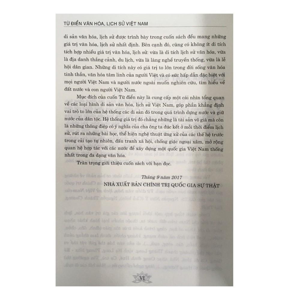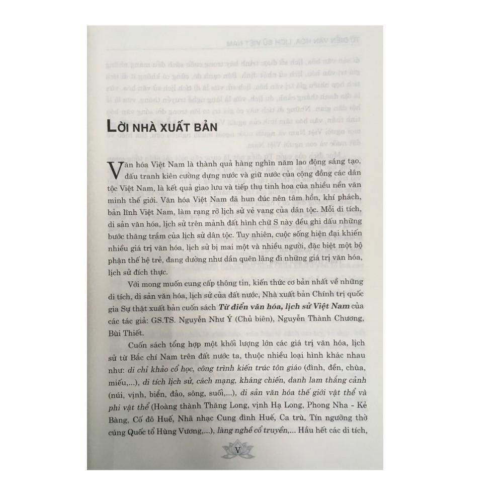 Văn hóa Việt Nam là thành quả hàng nghìn năm lao động sáng tạo, đấu tranh kiên cường dựng nước và giữ nước của cộng đồng các dân tộc Việt Nam, là kết quả giao lưu và tiếp thu tinh hoa của nhiều nền văn minh thế giới. Với mong muốn cung cấp thông tin kiến thức cơ bản nhất về những di tích, di sản văn hóa, lịch sử của đất nước, Nhà xuất bản Chính trị quốc gia Sự thật xuất bản cuốn sách Từ điển văn hóa, lịch sử Việt Nam của tác giả: . Nguyễn Như Ý (Chủ biên), Nguyễn Thành Chương, Bùi Thiết.