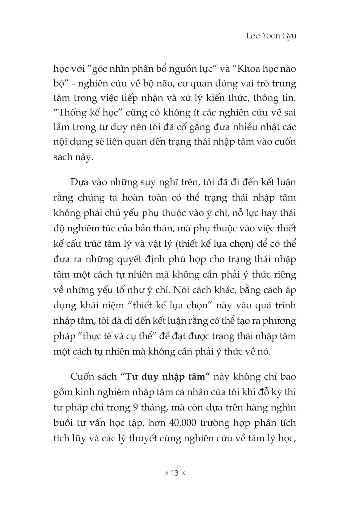 - Phù hợp với người làm việc trí óc, sáng tạo, học tập chuyên sâu: Đặc biệt hữu ích với học sinh, sinh viên, người đi làm, người theo đuổi mục tiêu dài hạn hoặc mong muốn thoát khỏi sự xao nhãng kỹ thuật số. Tác giả cuốn sách - Lee Yoon Gyu Luật sư của Công ty Luật Garim, chủ tịch Hiệp hội Phương pháp học tập, đồng thời là người điều hành kênh YouTube “Dream School 이윤규변호사” với hơn 400.000 người theo dõi. “Tư duy nhập tâm” được xây dựng trên nền tảng chính kinh nghiệm thực tiễn của tác giả, cùng cơ sở khoa học não bộ để phát triển phương pháp thiết kế sự tập trung vào từng cá nhân một cách cụ thể và hiệu quả nhất. “Nhập tâm – tôi mời bạn bước vào sự tĩnh lặng ấy.” Trên đây là những nội dung nổi bật của cuốn “Tư duy nhập tâm” mà Unibooks gửi đến bạn đọc, những người muốn rèn luyện sự tập trung và nuôi dưỡng động lực một cách khoa học, bền vững. Hy vọng cuốn sách sẽ giúp bạn làm chủ tư duy, sống tập trung và hành động hiệu quả mỗi ngày. Chúc bạn luôn vững tâm giữa bộn bề xao nhãng. Hãy để Tư duy nhập tâm đồng hành cùng bạn!