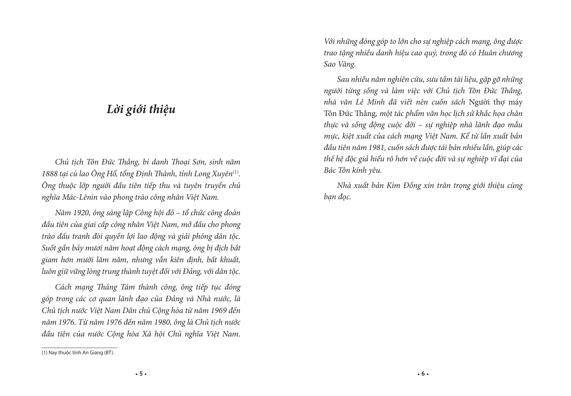 Tủ Sách Các Nhà Cách Mạng Tiền Bối - Người Thợ Máy Tôn Đức Thắng Bằng ngòi bút dung dị, tình cảm, nhà văn Lê Minh đưa độc giả theo chân Người thợ máy Tôn Đức Thắng từ thuở ấu thơ bên dòng sông Hậu tới xưởng Ba Son, từ những năm tháng tù đày ở địa ngục trần gian Côn Đảo tới ngày về trong mùa thu độc lập. Hành trình của Bác Tôn kính yêu – người chiến sĩ vô sản kiên trung, quả cảm – là nguồn cảm hứng cho lớp lớp thế hệ hôm nay và mai sau về lòng yêu nước, đức hi sinh và niềm tin bất diệt vào lí tưởng cách mạng.
