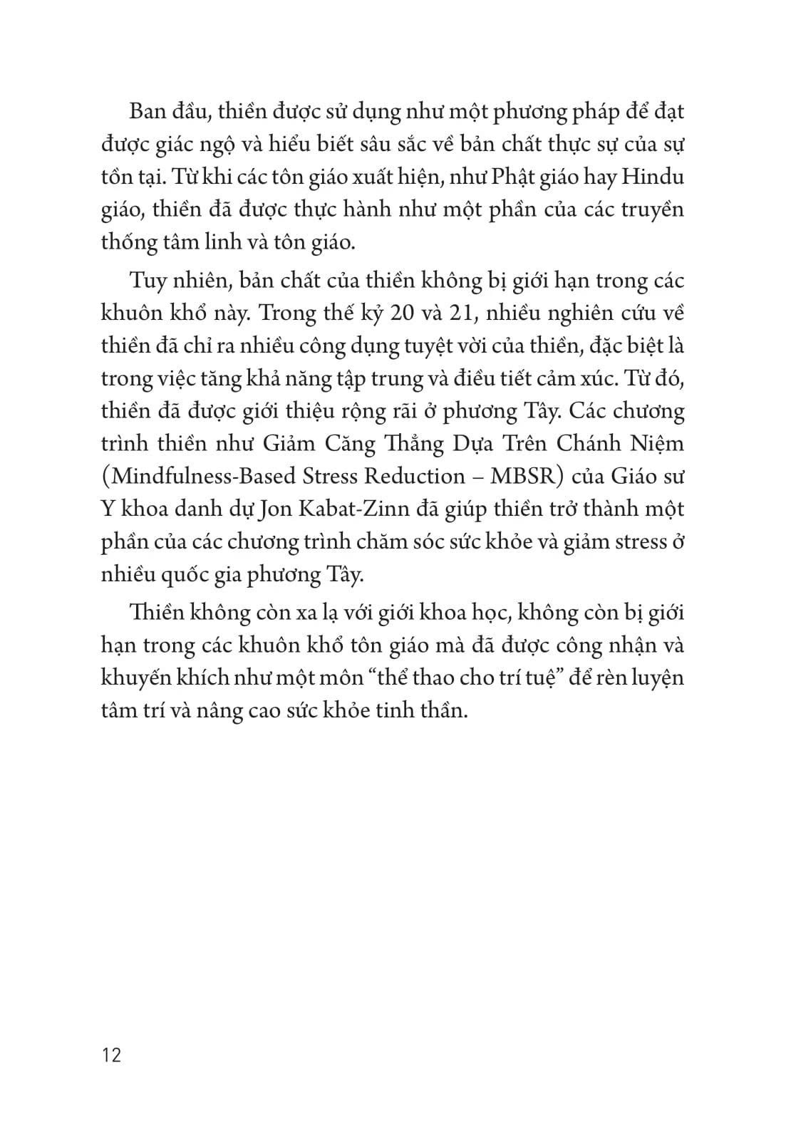 Cuốn sách này sẽ giúp bạn hiểu rằng thiền không phải là một sự thực hành mang tính tôn giáo mà là một loại hình thể dục cho tâm trí. Qua các nghiên cứu khoa học, thiền đã được chứng minh là có những tác động tích cực đến sức khỏe tinh thần và thể chất. Nó không chỉ giúp giảm căng thẳng, lo âu mà còn cải thiện khả năng tập trung và trí thông minh của chúng ta. Không những vậy, những phát hiện khoa học mới đây cho thấy thiền còn có thể giúp chống lão hóa.