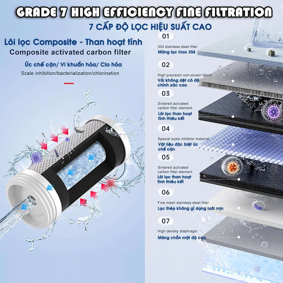 8 cấp độ lọc nghiêm ngặt, cho nguồn nước tinh khiết và an toàn hơn