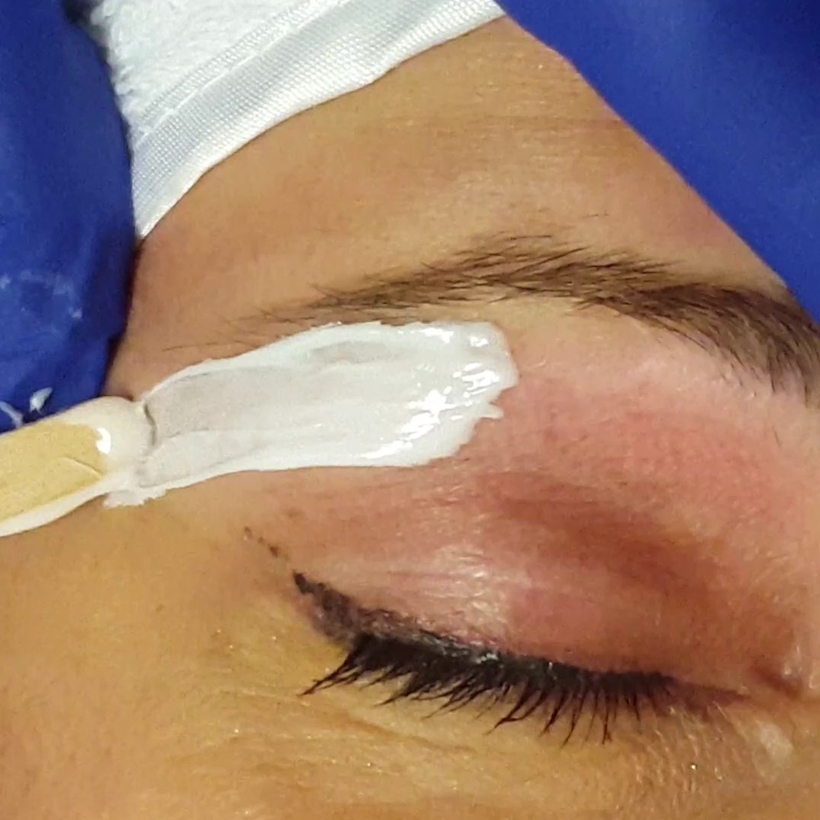 - Dùng que phết sáp mỏng & đều lên vùng da cần wax, phết sáp xuôi chiều lông mọc.