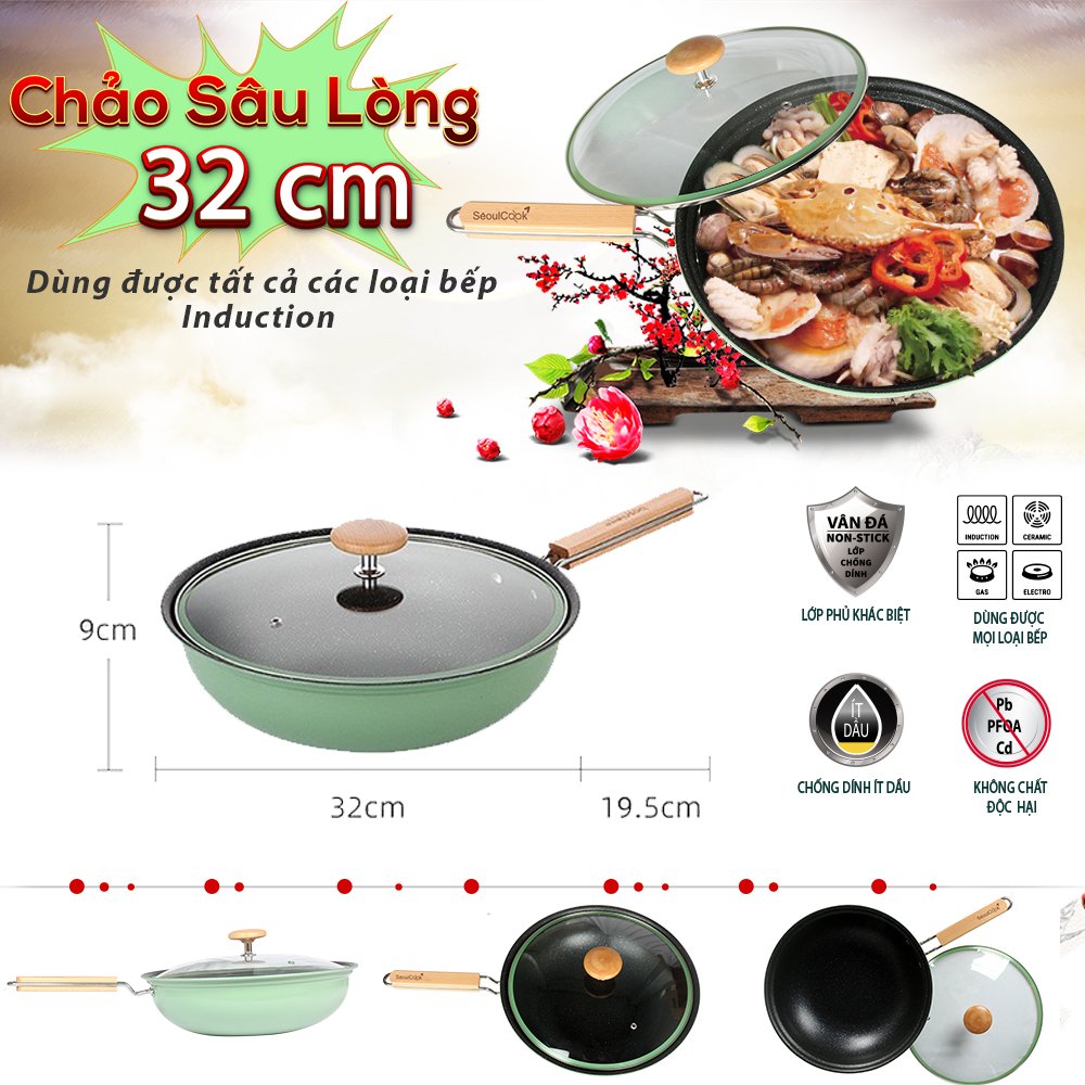 Bộ sản phẩm bao gồm: - 1 Chảo sâu lòng đáy từ 32cm Seoulcook Luxury màu xanh oliu + nắp kính 32cm - 1 Chảo vuông đáy từ Seoulcook 15x20 cm màu đen vân đá