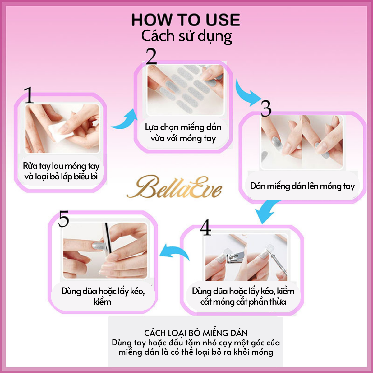 • Có thể để móng tay tự bong hoặc lấy 1 chiếc tăm nhỏ cạy 1 góc Miếng dán móng tay Bellaeve được nhiều các diễn viễn người mẫu nổi tiếng tại Hàn Quốc sử dụng. Được bán nhiều và rộng rãi trên các kênh Home Shopping tại Hàn Quốc