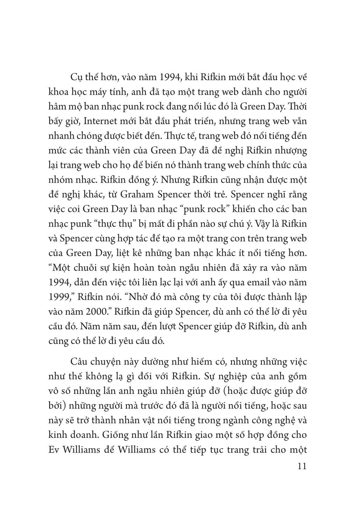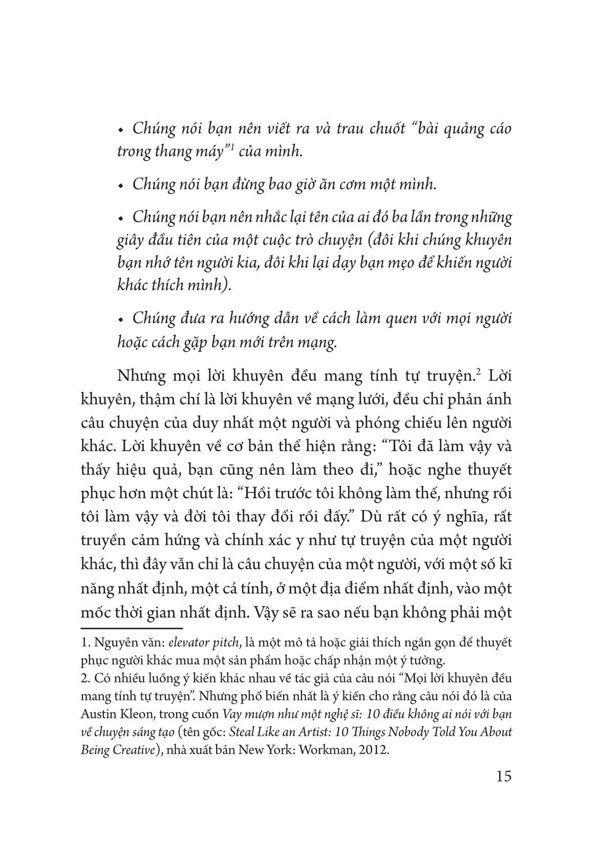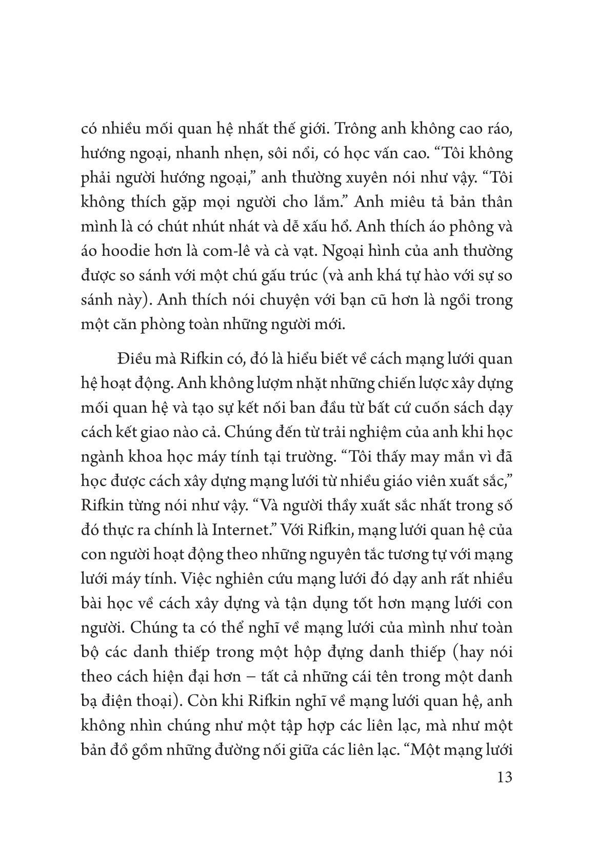 Đây không chỉ là cuốn sách dạy cách kết giao. Cuốn sách này không giống bất cứ cuốn sách dạy kết giao nào mà bạn từng đọc (hoặc đã bỏ qua) trước đó. Đây là một cuốn sách nói về cách mạng lưới vận hành trong thực tế. Sẽ không có những lời khuyên sáo rỗng và những hướng dẫn cụ thể về cách gặp gỡ bạn mới hoặc cách bắt chuyện làm quen. Sẽ không có cách quản lí hay làm đẹp trang mạng xã hội của bạn. Đã có rất nhiều cuốn sách như vậy rồi nên thêm một cuốn nữa cũng chẳng ích gì – hơn thế, chỉ mở rộng số lượng người quen thôi thì không đủ.