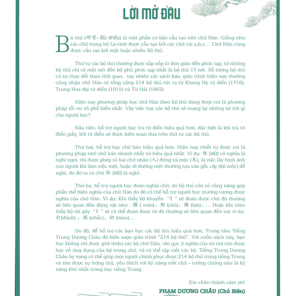 Do đó, để hỗ trợ các bạn học các bộ thủ hiệu quả hơn, Trung tâm Tiếng Trung Dương Châu đã biên soạn giáo trình “214 bộ thủ”. Với cuốn sách này, bạn học không chỉ được giới thiệu các bộ chữ Hán, tên gọi, ý nghĩa của nó mà còn được học về ứng dụng của bộ trong chữ, và có thể tập viết các bộ. Tiếng Trung Dương Châu hy vọng có thể giúp mọi người chinh phục được 214 bộ thủ trong tiếng Trung và tìm được sự hứng thú, yêu thích với kỹ năng viết chữ - tưởng chừng như là kỹ năng khó học trong học tiếng Trung.