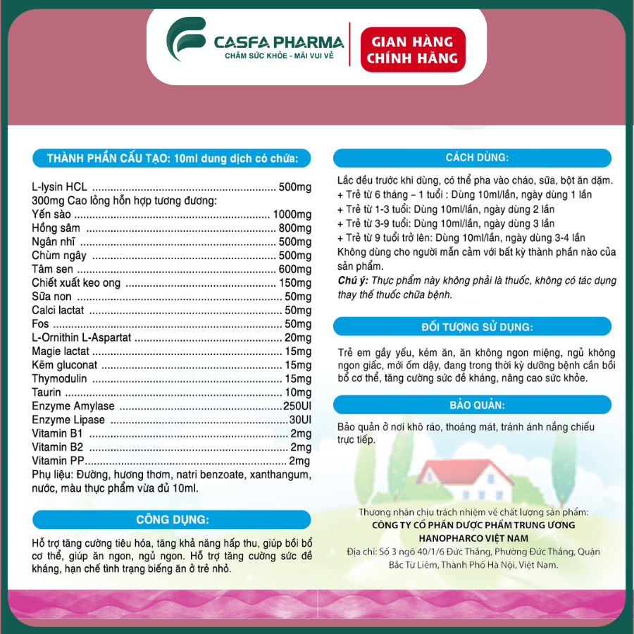 - Vitamin PP: 2mg Phụ liệu: Đường, hương thơm, natri benzoate, xanthangum, nước, màu thực phẩm vừa đủ10ml ️ CÔNG DỤNG: