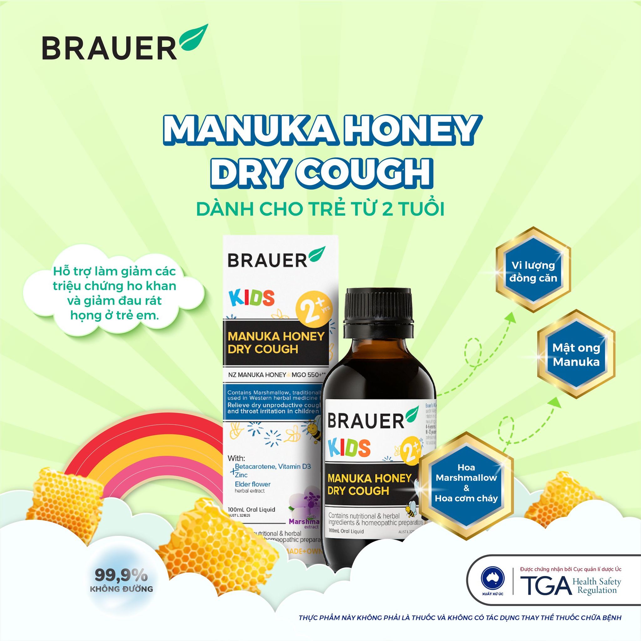Siro hỗ trợ giảm ho cho trẻ từ 2 tuổi Brauer Manuka Honey Úc giảm ho, ngứa và rát cổ họng, làm mát và dịu cổ họng, tăng sức đề kháng - OZ Slim Store