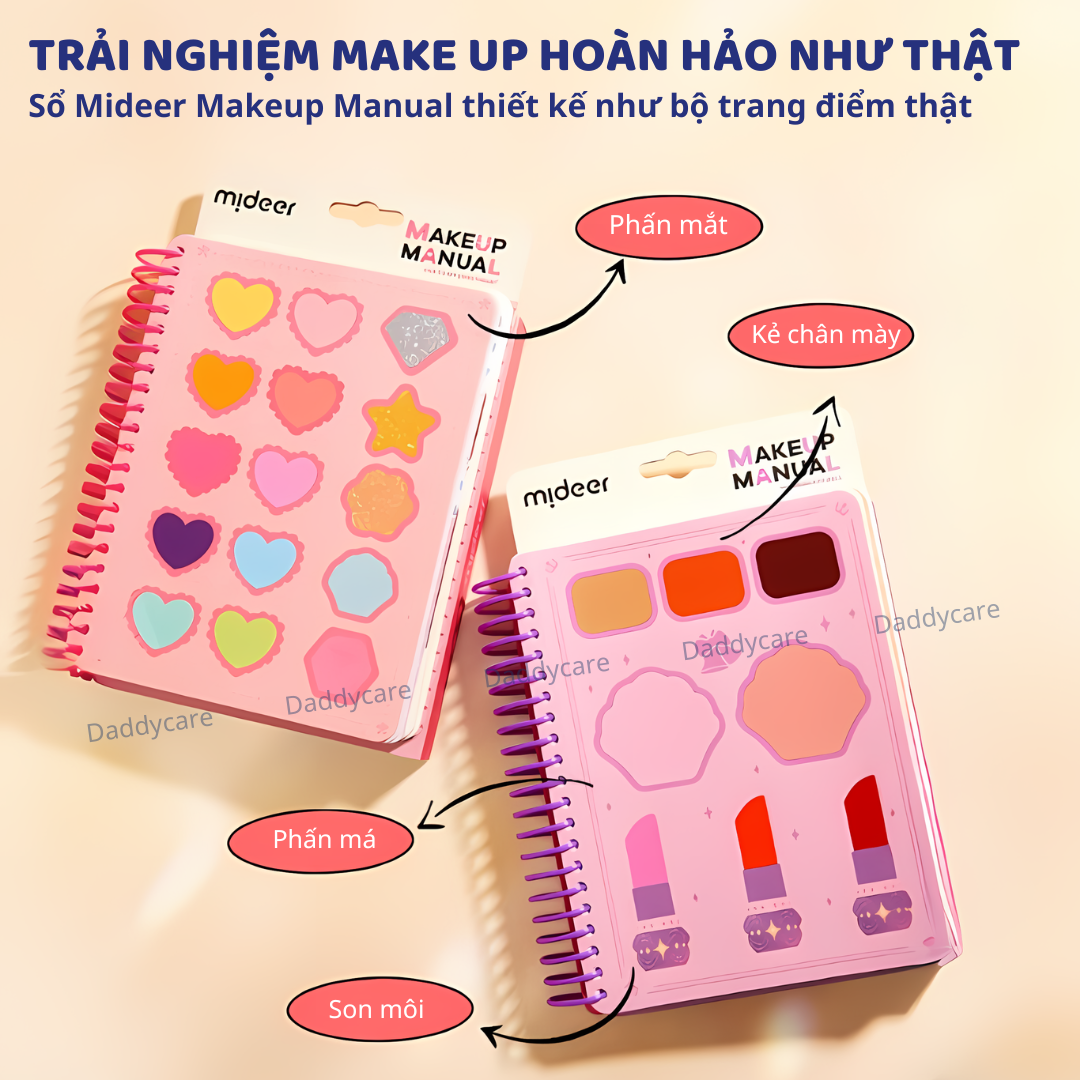 - TRẢI NGHIỆM MAKE UP HOÀN HẢO NHƯ THẬT Sổ Mideer Makeup Manual được thiết kế như một bộ trang điểm thật, đầy đủ: Bột kẻ lông mày, má hồng, son môi và phấn mắt.