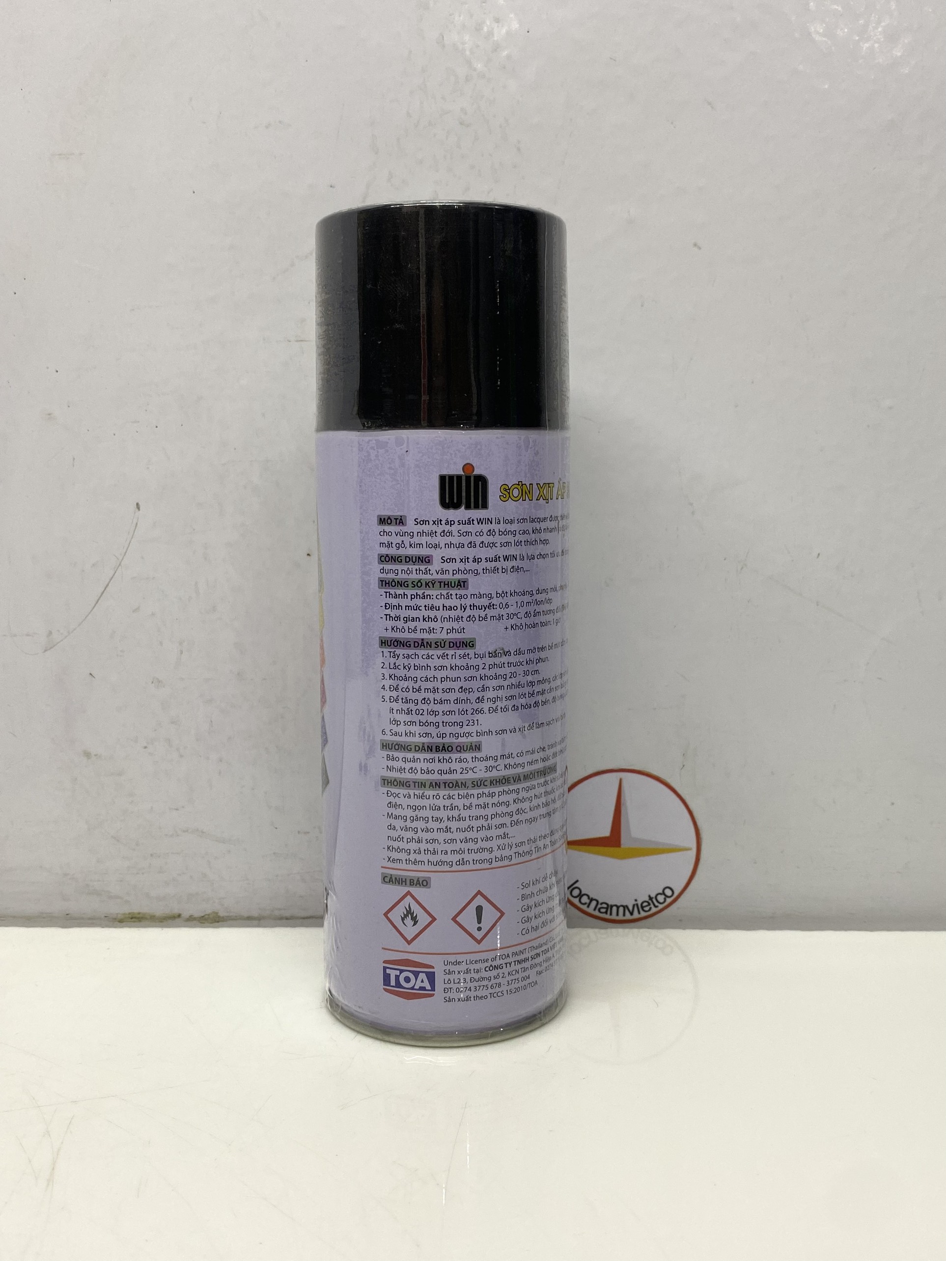 - Khô hoàn toàn:Sau 1 giờ Một số mã màu sơn xịt Win khác: Clear 231(Không màu); màu trắng white 200; màu bạc bright silver; màu đỏ 211 red; màu đen mờ flat black 212; màu đen black 210; màu xanh 224 sky blue; màu xanh 213; màu xanh river blue 242; màu xanh ford tractor blue 238; màu xanh đen dark blue 216; màu tím 240 violet; turquoise 223; màu xanh apple green 217; màu xanh green 214; màu black board green 225; machine green 281; olive green 268; màu kem 219 cream; màu vàng yellow 218; màu vàng medium yellow 241 màu cam 226 orange; màu hồng pink 229; màu xanh đen dark green 230; màu trắng xám 232; màu xám kusota 958; màu xám grey 215; màu xám sáng light grey 221; màu xám medium grey 220; màu nâu cocoa brown 265; màu đỏ deep red 239; màu maroon new 222; màu grey A70 Sơn xe mô tô, xe máy, xe đạp WIN: Màu mêta đỏ candy red 236; màu meta xanh wave green A007; màu meta xanh dương candy blue 235; Màu nho dream H012; Sơn nhũ bạc meta hat nhỏ undercoat silver A100; sơn nhũ bạc mê ta hạt lớn candy tone 404 màu candy green 234; màu mêta đồng gold 228. Sơn xịt màu đặc biệt: Màu xi mạ vàng K83 Pearl gold Sơn xịt chịu nhiệt(600 độ C/ 1200 độ F): Sơn chịu nhiệt đen mờ H51, sơn chịu nhiệt bạc sáng H52 Sơn lót chống rỉ: Sơn lót màu xám primer surfacer grey 266; sơn lót chống rỉ màu đỏ chu Anti-rust primer 267. HƯỚNG DẪN THI CÔNG: