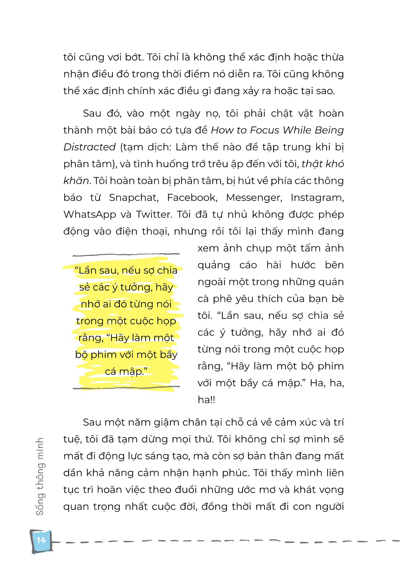- Khả năng sáng tạo Ai là người nắm giữ số phận của bạn? Liệu có phải bạn không? Nếu bạn thấy m.ình không thể kéo dài hơn một vài phút mà không kiểm tra điện thoại hoặc trở thành nạn nhân của một số phiền nhiễu kỹ thuật số khác, thì bạn không đơn độc đâu. Tác động ăn mòn của sự xao lãng và làm nhiều việc cùng lúc là rất quan trọng và bạn biết m.ình có khả năng làm được nhiều hơn thế. Hãy đọc cuốn sách này để tìm hiểu cách bạn có thể làm chủ khả năng tập trung và sáng tạo, đồng thời ngừng để những phiền nhiễu làm chủ bạn. Sống thông minh nói về:
