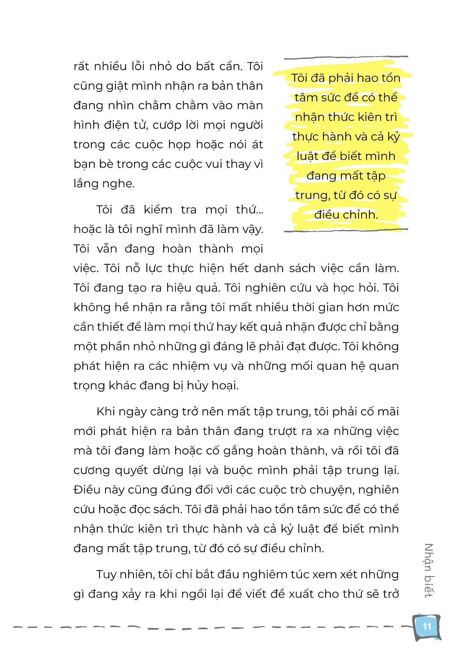 - Sống và làm việc trong hiện tại, tâm trí không lang thang đâu đó, lo lắng về việc bỏ lỡ hay nóng lòng chờ đợi điều tiếp theo.