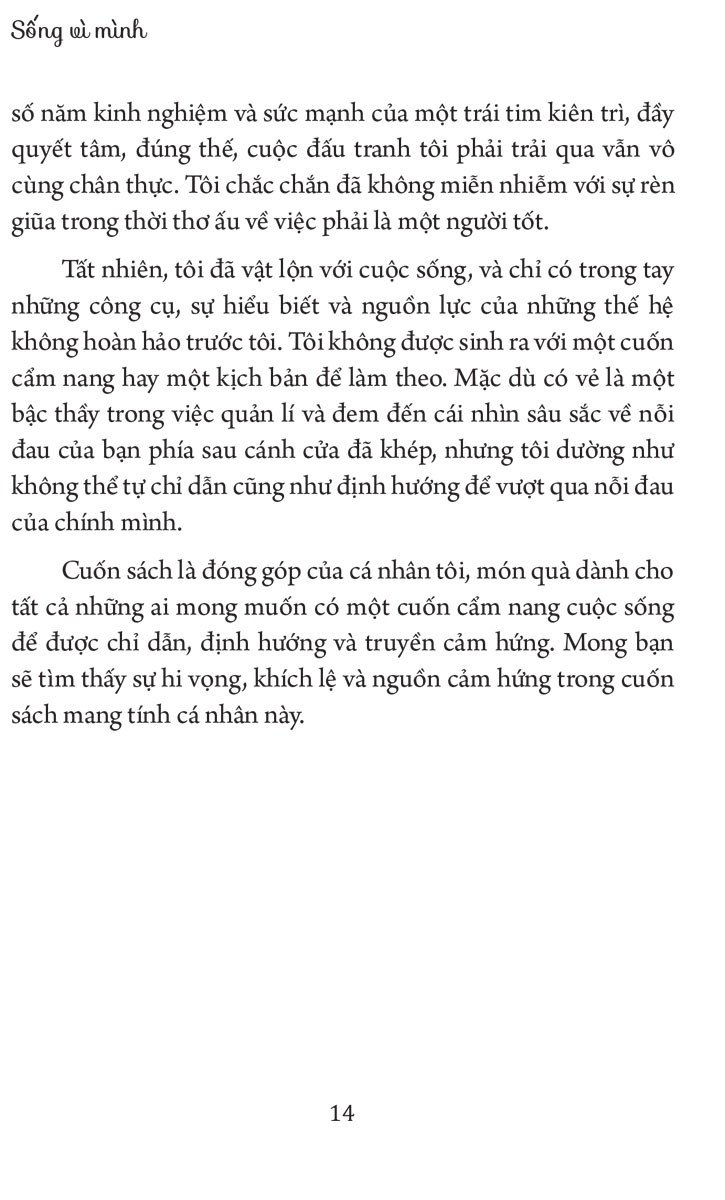 Mua tại TiktokSống Vì Mình Bạn có cảm thấy bất hạnh không? Bạn có cảm thấy bị đối xử tàn tệ không? Bạn có xu hướng nỗ lực rất nhiều trong mối quan hệ không? Bạn có kiệt quệ hay cạn năng lượng không? Bạn có cảm thấy không được trân trọng không? Bạn có đang làm việc quá sức không? Hay bị trả lương quá thấp không? Nếu câu trả lời là có cho một hoặc nhiều câu hỏi ở trên, cuốn sách này là dành cho bạn! Nếu bạn nhận ra những cảm giác này hoặc thấy mình ở trong bất cứ tình trạng nào như đã kể trên mà không thể thoát ra, đã đến lúc tự hỏi bản thân rằng mình đang cho phép điều gì xảy ra? Sự thật khó chấp nhận là, không có tình trạng nào trong số những tình trạng kể trên có thể tồn tại lâu dài mà không có sự cho phép của bạn. Nếu bạn đang ở trong những tình huống hoặc mối quan hệ chỉ đem lại cảm giác tiêu cực, thì có nghĩa là bạn đang tiếp tay hoặc chấp nhận một điều gì đó. Những trạng thái dài hạn này không ngẫu nhiên xảy ra mà cần đến sự thuận theo của họ. Cuốn sách là hành trình hướng vào các tổn thương bên trong Cuốn sách SỐNG VÌ MÌNH là một cuộc hành trình hướng vào bên trong, để bạn nhìn vào những gì bạn đang cho phép xảy ra trong cuộc sống của mình. Cuốn sách là món quà tri thức, sự thấu hiểu và các công cụ để giúp bạn chịu trách nhiệm hoàn toàn cho cuộc sống của mình. Cuốn sách là một hành trình nội tâm của công cuộc khám phá bản thân, sự trung thực và trách nhiệm cá nhân, để soi sáng những góc sâu kín nhất của cảm xúc, suy nghĩ, niềm tin, nhu cầu, thói quen, và khuôn mẫu hành động của bạn. Cuốn sách giúp bạn tự chịu trách nhiệm cho cuộc sống của mình Không phải lúc nào bạn cũng đạt được những gì mình muốn, nhưng như Mick Jagger đã hát: "Nếu thỉnh thoảng cố gắng, bạn sẽ tìm được những gì mình cần." SỐNG VÌ MÌNH, như cái tên của nó, dẫn bạn bước lên con đường tự chịu trách nhiệm cho hạnh phúc của chính mình. Con đường đó dẫn tới đâu? Mời bạn cùng Minh Long khám phá trong cuốn sách này, bạn sẽ không thất vọng!