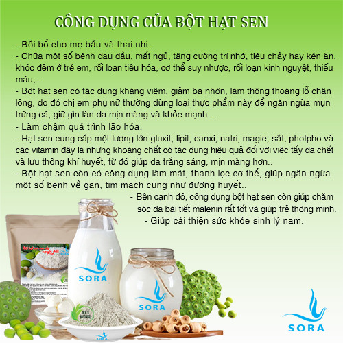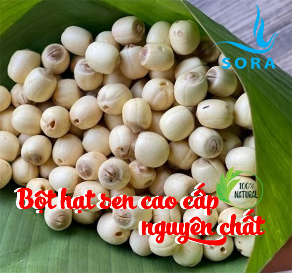 Hạt sen có hàm lượng các chất protein, magie, kali và phốt pho cao, trong khi hàm lượng mỡ bão hòa, natri và  lại rất thấp. Trong y học, hạt sen được xem như một dược phẩm quý, có thể chữa các loại bệnh như , suy nhược thần kinh, , ăn kém, tâm phiền và bệnh ăn uống khó tiêu.    Trong 100g hạt sen có chứa 350 calo, 63-68g , 17-18g protein, nhưng chỉ có 1,9-2,5g mỡ, còn lại là các thành phần khác như nước, khoáng chất khác. Theo kết quả nghiên cứu, trung bình cứ 100 gam hạt sen khô có thể cung cấp khoảng 18g protein chất lượng cao và chất xơ. Đặc biệt, hạt sen không chứa đường mà lại có hương vị thơm ngon hợp với sở thích của nhiều người.     Bột hạt sen cao cấp nguyên chất Sora được sản xuất bằng quy trình công nghệ hiện đại. Tuy mất đi lượng nước trong hạt sen tươi, nhưng bột hạt sen vẫn đáp ứng đầy đủ chất dinh dưỡng và vitamin.