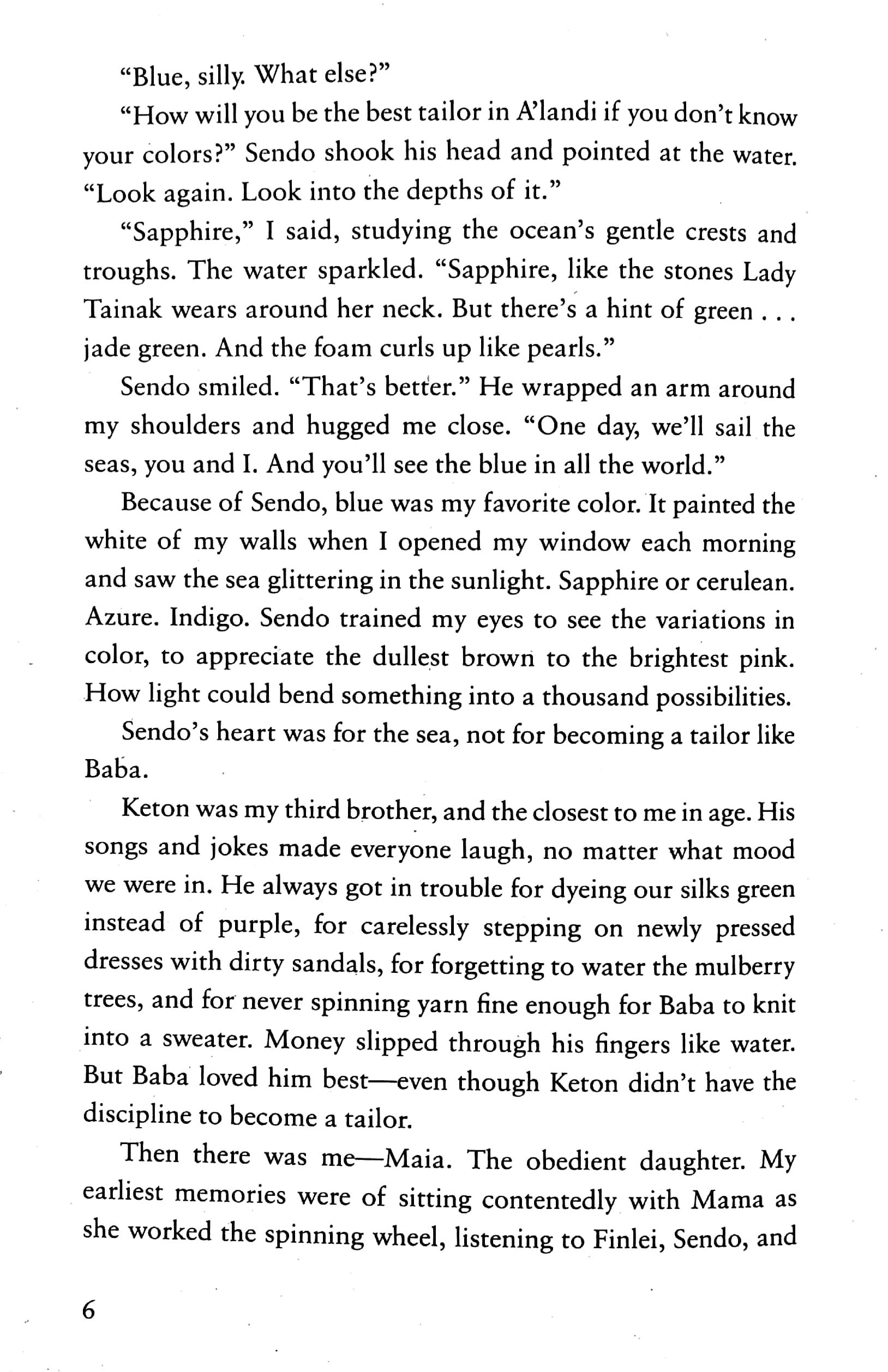 Backstabbing and lies run rampant as the tailors compete in challenges to prove their artistry and skill. Maia's task is further complicated when she draws the attention of the court magician, Edan, whose piercing eyes seem to see straight through her disguise.