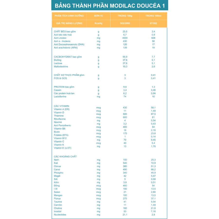 • Mỗi lon sữa Modilac Doucea đều trải qua hơn 40 năm cải tiến không ngừng, phù hợp với sự phát triển của bé.