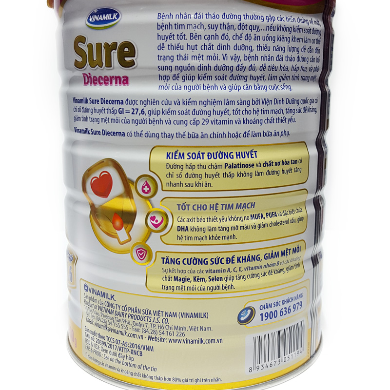 - Vinamilk Sure Diecerna được nghiên cứu lâm sàng bởi Viện Dinh Dưỡng Quốc Gia có chỉ số đường huyết thấp GI = 27,6, giúp kiểm soát đường huyết, tốt cho hệ tim mạch, tăng sức đề kháng, giảm tình trạng mệt mỏi của người bệnh và cung cấp 29 vitamin và khoáng chất thiết yếu.