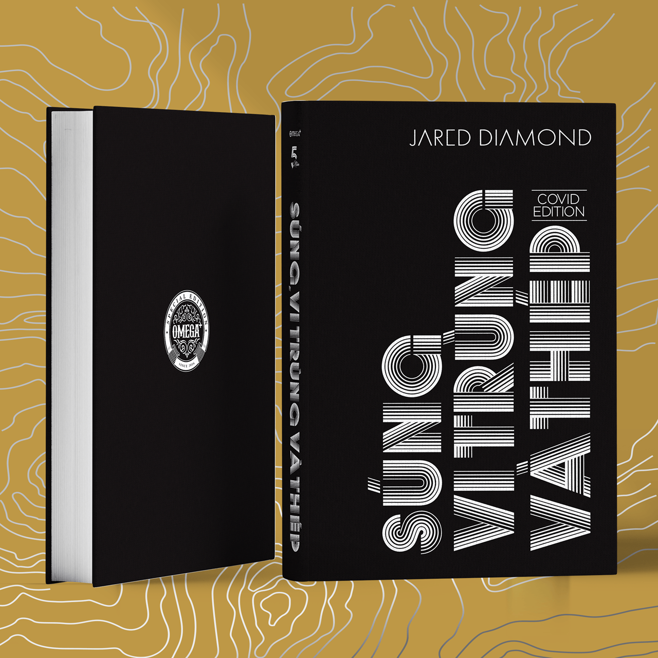 Gáy tròn, bìa cứng bọc vải, nền đen ép nhũ kim chữ “Súng, vi trùng và thép”, dập chìm tinh tế, sang trọng, có in dấu ấn phiên bản Covid Edition, bìa sau in logo bản đặc biệt Omega+.