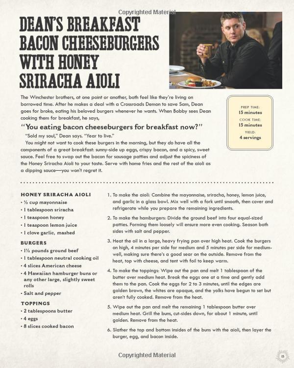 Whether you're a seasoned chef, beginner cook, or diner food enthusiast like the Winchester Brothers, Supernatural: The Official Cookbook brings a variety both savory and sweet recipes from the show to life. When they aren't keeping humanity safe from all kinds of otherworldly threats, Dean and Sam often take time to eat and devise their next steps for hunting monsters at a small-town diner. This complete culinary guide features some of the brothers' favorite dishes, such as Dean's breakfast Pigs 'N A Poke, cheeseburger and fries, angel food cake, Sam's salads--and, of course, pie!