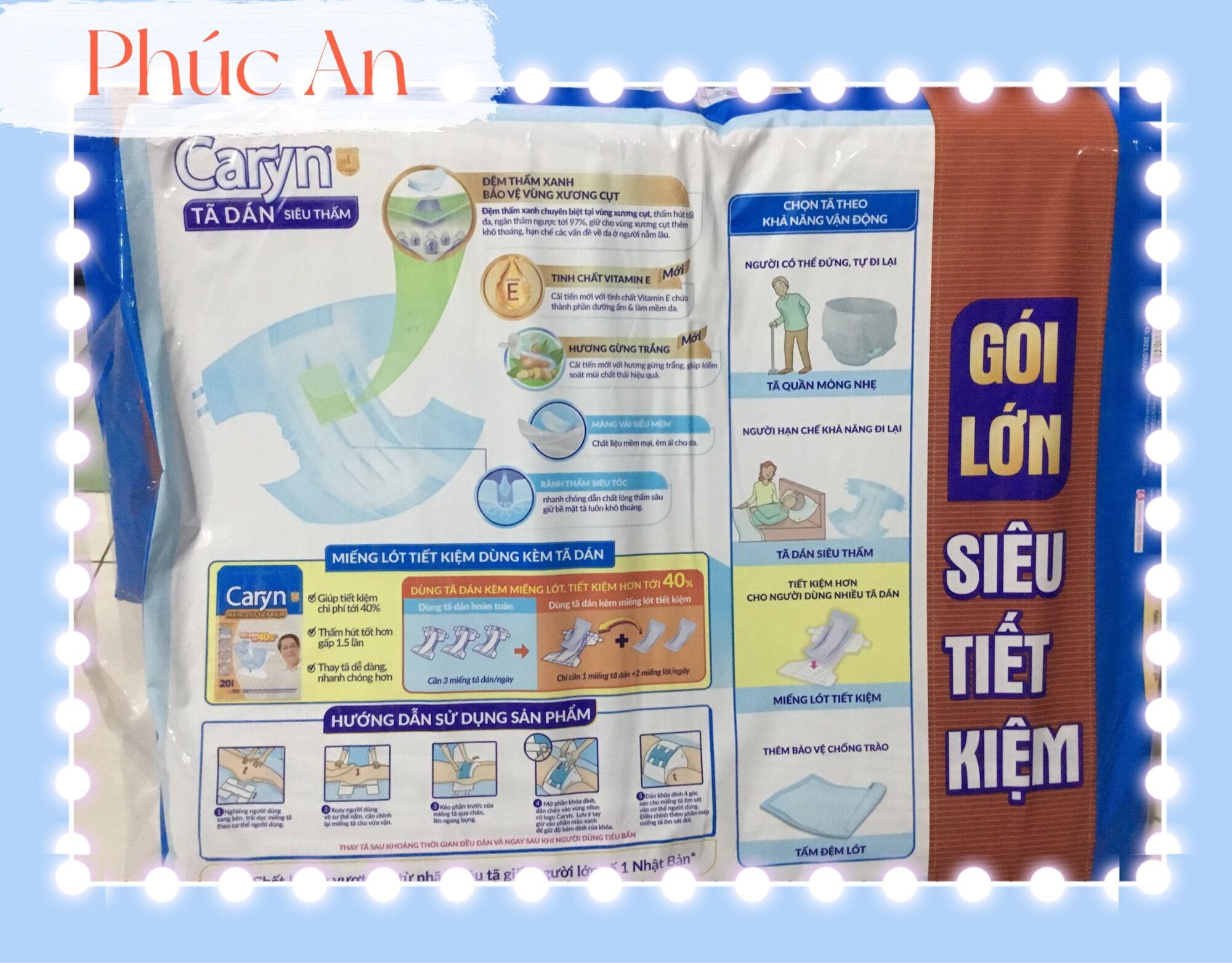 Mô Tả Sản Phẩm Tã Dán người lớn Caryn Gói Lớn Tã dán Siêu thấm Caryn cải tiến mới với “Đệm thấm xanh" chuyên biệt tại vùng xương cụt, với các hạt thấm hút tăng