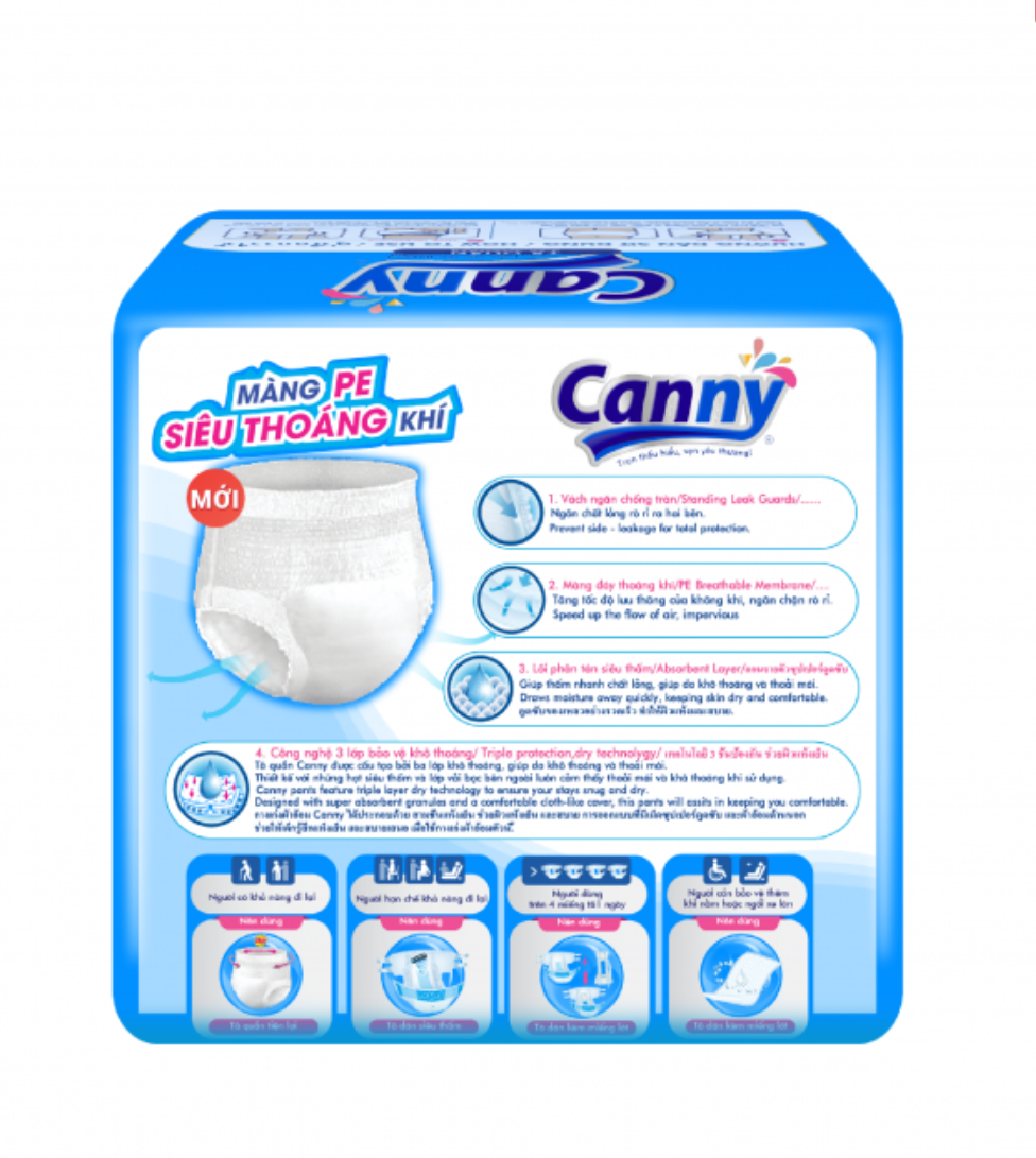 - Tã quần người lớn Canny Công nghệ 3 lớp bảo vệ khô thoáng Tã quần Canny được cấu tạo bởi 3 lớp khô thoáng giúp da khô thoáng và thoải mái. Tã quần người lớn Canny Thiết kế với những hạt siêu thấm và lớp vải bọc bên ngoài luôn cảm thấy mềm mại, êm ái và khô thoáng, thoải mái khi sử dụng. Sản phẩm được sản xuất bởi Công Ty TNHH Javi.