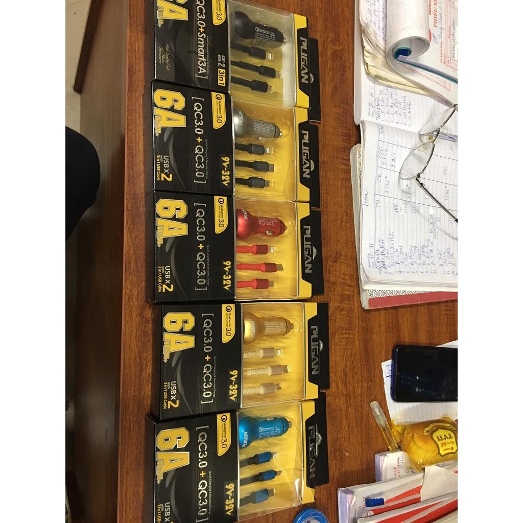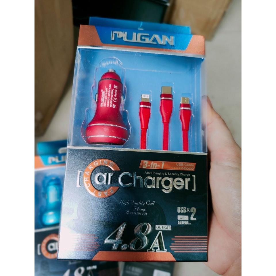Tẩu sạc nhanh kèm dây cáp 3 đầu Ô tô xe hơi chính hãng Pugan với 2 chức năng sạc thông minh và sạc siêu tốc 4.8A