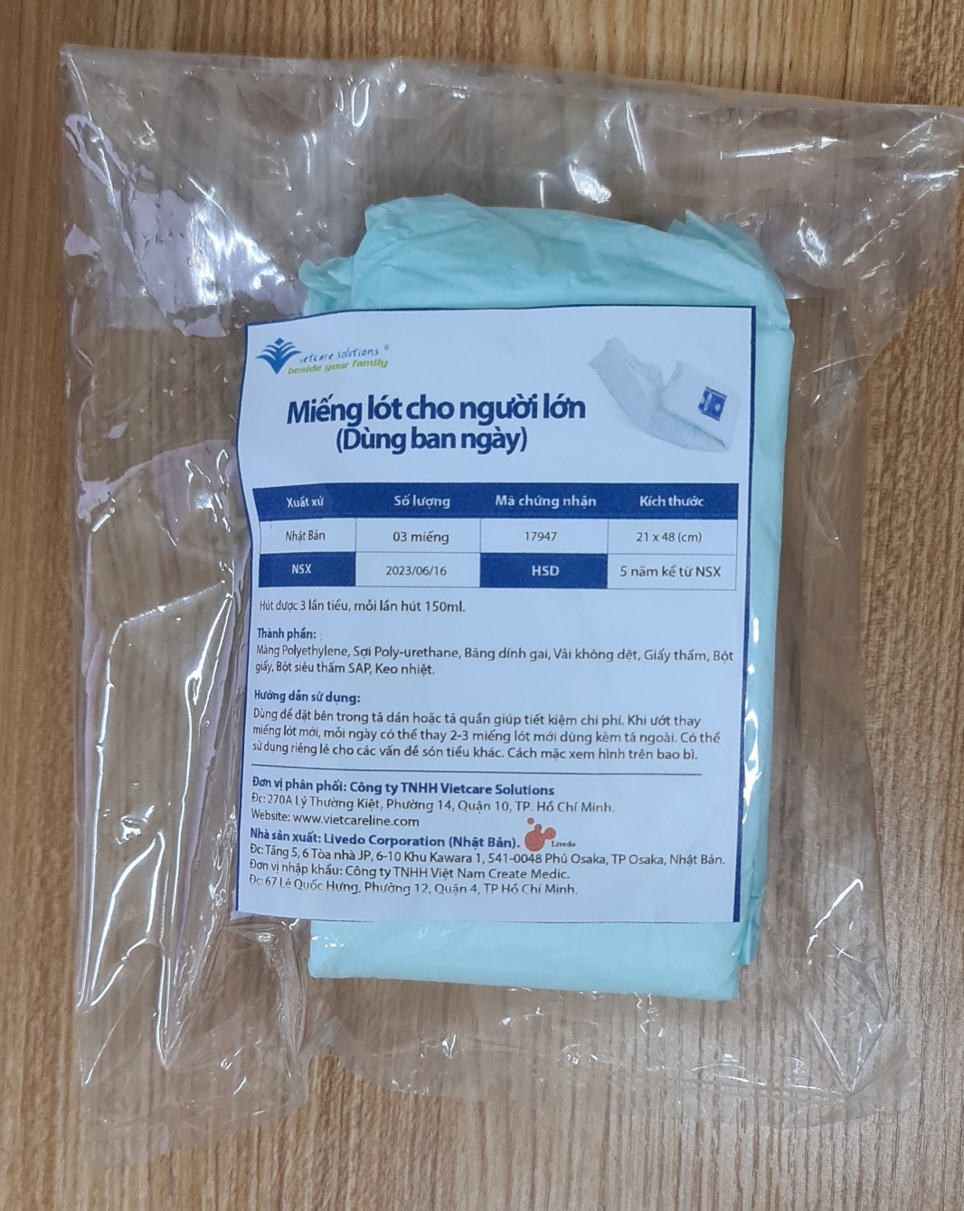 - 03 miếng lót/ gói Hướng dẫn sử dụng, bảo quản Sử dụng kết hợp với tã-bỉm quần hoặc dán Livedo giúp tăng cường độ thấm hút cho người dùng Bảo quản nơi khô ráo, thoáng mát, tránh ánh nắng trực tiếp và nhiệt độ cao