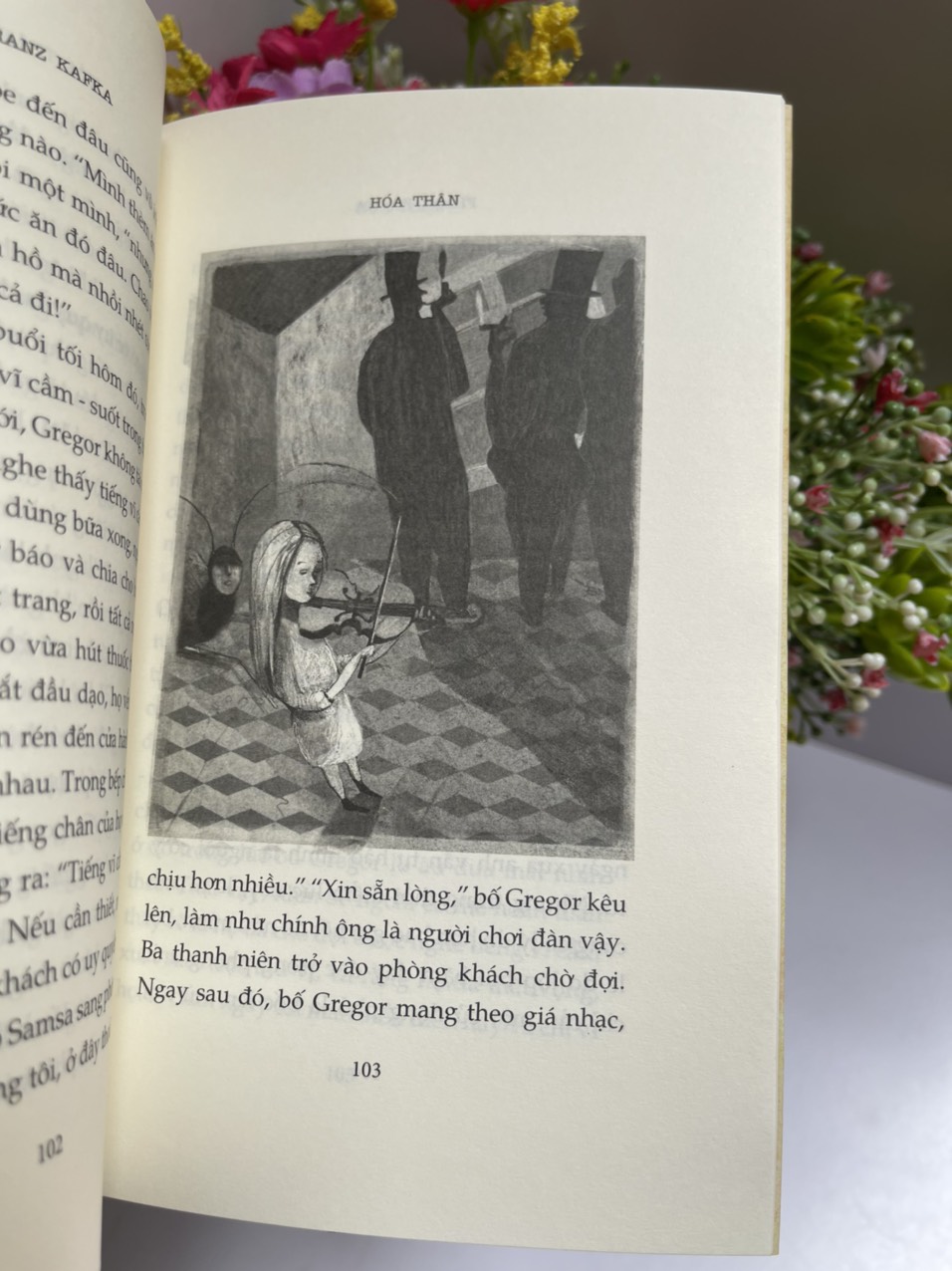 "Một sáng tỉnh giấc sau những giấc mơ xáo động, Gregor Samsa, nằm trên giường, nhận thấy mình đã biến thành một con côn trùng khổng lồ. Anh nằm ngửa trên cái lưng rắn như thể được bọc giáp sắt, và khi dợm nhấc đầu lên, anh nhìn thấy bụng mình khum tròn, nâu bóng, phân chia làm nhiều đốt cong cứng đờ, tấm chăn bong đắp trên bụng đã bị xô lệch, gần tuột hẳn. Chân anh nhiều ra, mảnh khảnh đến thảm hại so với phần còn lại của thân hình to đùng, vung vẩy bất lực trước mắt anh."