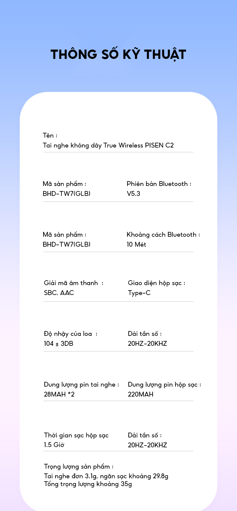 Tai nghe Bluetooth PISEN C2 ANC ENC True wireless ( Màu trắng) - Hàng chính hãng, bảo hành 18 tháng Nâng cấp lớn về thính giác - Nhỏ và nhẹ trên tai Thiết kế hộp nắp gập : dễ dàng lấy và cất, phong cách mới lạ Tuổi thọ pin dài : đi cùng bạn từ sáng tới tối Micro hd : cuộc gọi rõ ràng và không tiếng ồn Cuộn dây lớn 10mm : chất lượng âm thanh trong suốt và tự nhiên Tai nghe chỉ 3.1g : trải nghiệm đeo siêu nhẹ Ipx4 chống thấm nước : không sợ mồ hôi và mưa Công nghệ bluetooth 5.3 : kết nối nhanh chóng không chờ đợi Thiết kế buồng cửa mở Bật nhẹ để bắt đầu hành trình âm nhạc Ngăn sạc bán mở kiểu buồng lái sáng tạo của pisen, âm nhạc sẽ nhẩy múa xung quanh bạn ngay khi mở nắp Từ tính siêu mạnh – lấy và cất mượt – cảm giác mượt mà Nhẹ nhàng và dễ chịu Không cảm giác, thoải mái hơn khi đeo Thiết kế gọn nhẹ, tự nhiên và vừa vặn với vành tai, đeo như không đeo (ý nó nói là nhẹ, không gây khó chịu) 3.1g giải phóng áp lực ở cả 2 tai Rẻ mà hay Chất lượng âm thanh hifi, sóng âm dâng trào, như đang ở hiện trường Cuộn dây động kích thước lớn 10mm và màng ngăn polymer Giảm tiếng ồn cuộc gọi enc Tránh xa tiếng ồn, giao tiếp thoải mái Tích hợp micro hd, nhận chính xác giọng nói, bất kể tiếng ồn của gió hay tầu điện ngầm, các cuộc gọi đều có độ phân giải cao luôn lọc bỏ tiếng ồn Chống ồn chủ động ANC Tận hưởng âm nhạc và trò chuyện với bạn bè thoải mái ngay cả khi trong môi trường ồn ào Thời lượng pin 25h Luôn sẵn sàng cho cả ngày Được trang bị ngăn chứa pin, toàn thời lượng pin là 25h, du lịch / đi lại / tập thể dục, tạm biệt nỗi lo về pin Dữ liệu từ pisen lab và chỉ mang tính tham khảo, thực tế có thể khác do môi trường và cách sử dụng Tai nghe tốt luôn hiểu ý bạn Điều khiển mượt chỉ bằng một cú chạm Chạm vào vùng cảm ứng, điều khiển tai nghe, trả lời cuộc gọi và tùy chỉnh nhạc, thiết kế tiện lợi Pause/ play : bấm đúp vào tai phải / trái Chuyển bài trước : nhấn và giữ tai trái (L) 1.5 giây Trả lời / cúp máy : bấm đúp vào tai trái hoặc phải Chuyển bài tiếp theo : nhấn và giữ tai phải (R) 1.5 giây Trải nghiệm mới về âm nhạc chất lượng Kết nối ngay sau khi mở nắp, đeo và nghe Công tắc được tích hợp, mở nắp tai nghe và kết nối tự động, nhấc lên và sử dụng, thoải mái hơn Không sợ mồ hôi và mưa Chống thấm ipx4, không sợ mồ hôi và mưa, tập luyện không lo lắng Đừng để phân tâm khi tập luyện, thưởng thức âm nhạc một cách trọn vẹn (background music – nhạc nền) THÔNG SỐ KỸ THUẬT: Tên sản phẩm : Tai nghe không dây True Wireless PISEN C2  Mã sản phẩm: bhd-tw7 Kết nối: không dây bluetooth v5.3 Khoảng cách bluetooth 10m (môi trường mở không rào cản) Giải mã âm thanh : sbc, aac Giao diện hộp sạc:  type-c Độ nhậy của loa 104 ± 3db Dải tần số 20hz-20khz Độ nhậy của micro : -18.92db ± 3db Dung lượng pin tai nghe 28mah 2 Dung lượng pin ngăn sạc 220mah Thời gian sạc ngăn sạc khoảng 1.5h Trọng lượng sản phẩm : tai nghe đơn 3.1g, ngăn sạc khoảng 29.8g, tổng trọng lượng khoảng 35gĐộ nhậy của micro : -18.92db ± 3db