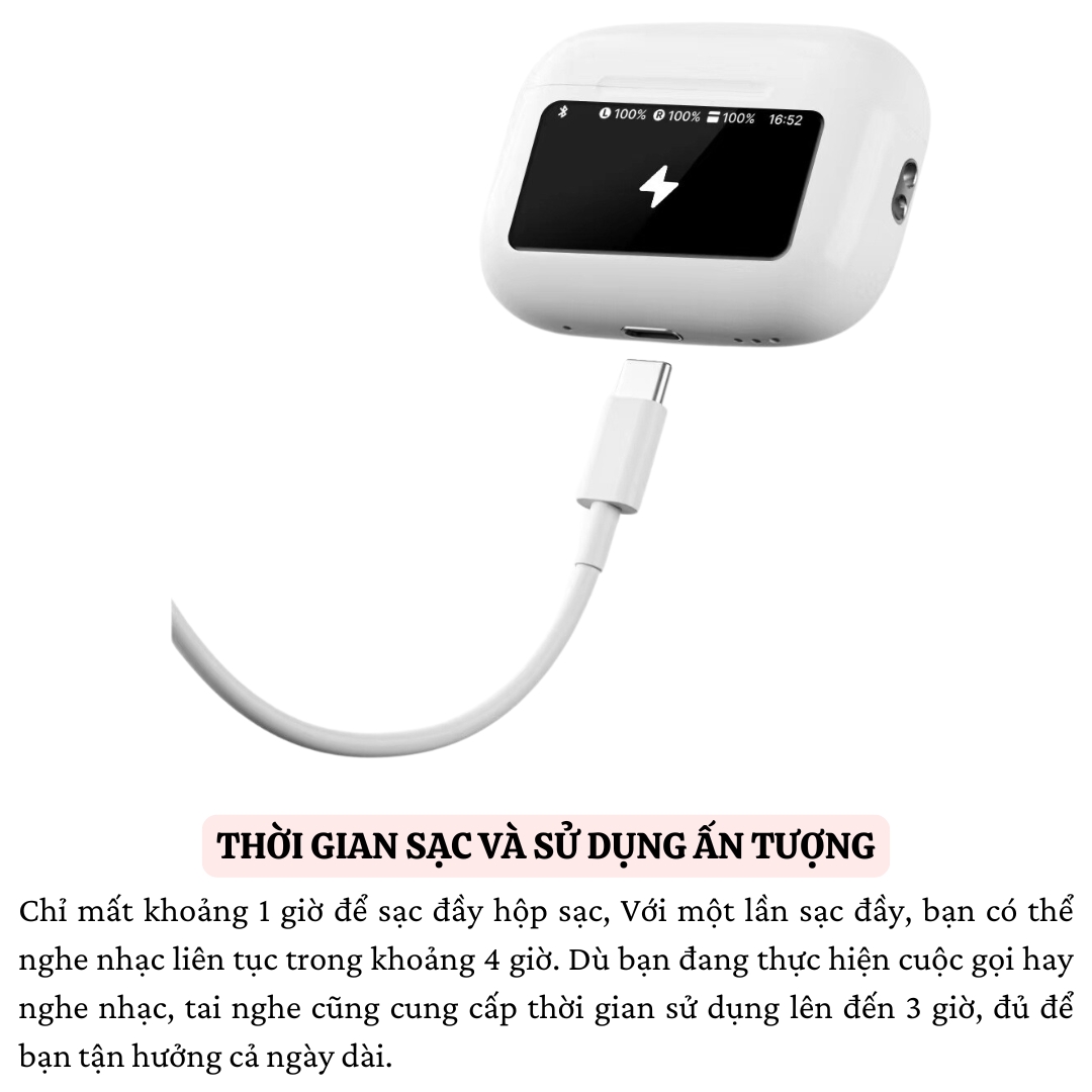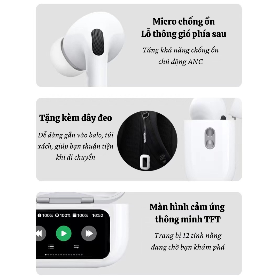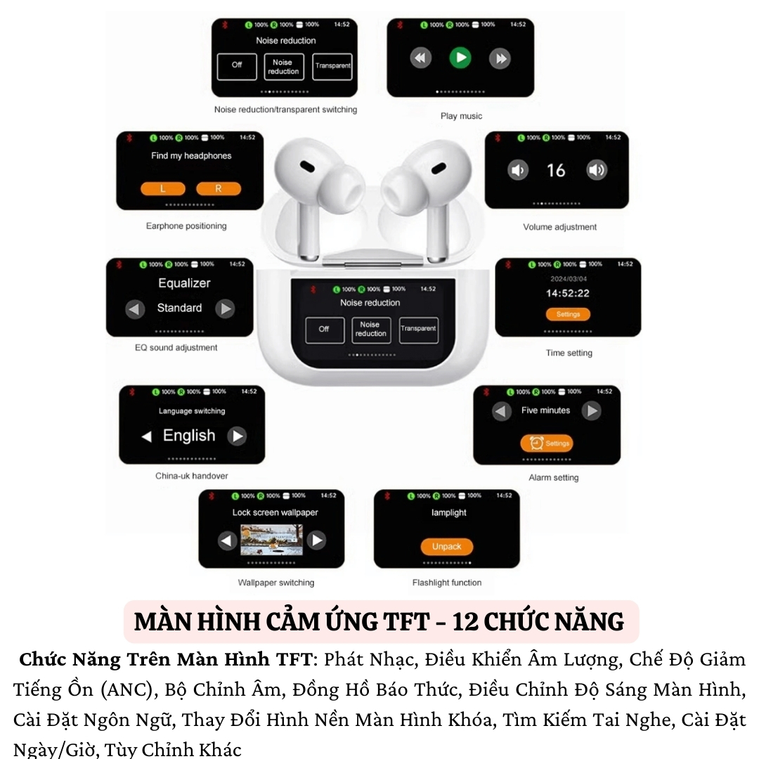 ai Nghe Bluetooth WIWU PRO 2 ANC T22 - Trải Nghiệm Âm Nhạc Tuyệt Đỉnh Thiết Kế Thời Thượng Với Màn Hình TFT Cảm Ứng WIWU PRO 2 ANC T22 mang đến cho bạn một trải nghiệm hoàn toàn mới với thiết kế hiện đại, tích hợp màn hình cảm ứng TFT đa màu sắc ngay trên hộp sạc. Với 12 chức năng phong phú, từ điều khiển âm lượng, phát nhạc, đến chế độ chống ồn, cài đặt ngày giờ và thậm chí là thay đổi hình nền, tất cả đều trong tầm tay bạn. Công Nghệ Chống Ồn Chủ Động ANC Chất lượng âm thanh luôn ở đỉnh cao với công nghệ ANC, giúp loại bỏ tiếng ồn xung quanh và mang lại trải nghiệm âm nhạc HiFi sống động. Bất kể bạn đang ở tàu điện ngầm, xe bus hay trong môi trường ồn ào, WIWU PRO 2 ANC T22 luôn đảm bảo âm thanh rõ ràng, sắc nét. 3 Chế Độ Âm Thanh Linh Hoạt WIWU PRO 2 ANC T22 cung cấp 3 chế độ âm thanh để phù hợp với mọi tình huống: