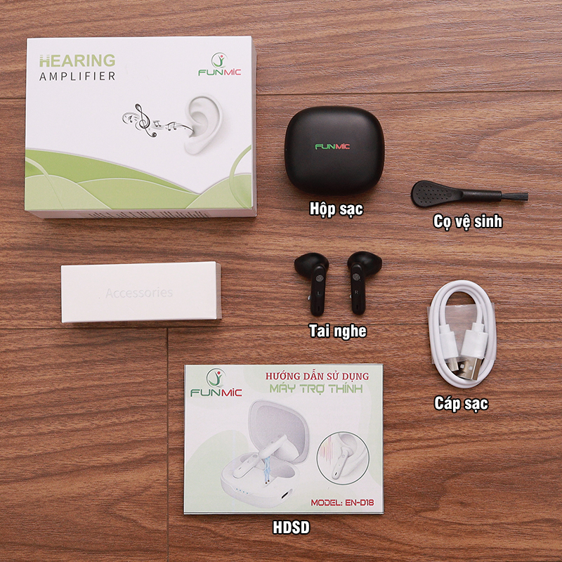 Không đeo máy trợ thính khi tắm, bơi lội, khi trời mưa to hoặc trong bầu không khí ẩm ướt như phòng tắm hơi. Thông số kỹ thuật tai nghe trợ thính Funmic EN-D18: Model: EN-D18 Thương hiệu: Funmic Âm thanh khuếch đại tối đa: <117dB Âm thanh khuếch đại trung bình: <111dB Tăng âm thanh tối đa: <40dB Tăng âm thanh trung bình: <35dB Độ méo tiếng: ≤5% Dải tần số: F1≤250Hz, F2≥5000Hz Tiếng ồn đầu vào: <32dB Cường độ dòng điện: ≤5mA Pin sạc: Lithium Thời gian sạc tai nghe: khoảng 2 giờ Trọng lượng sản phẩm: 3.5g Kích thước sản phẩm: 33.7x19.2x18.5 mm Kích thước đóng gói: 120 x 90 x 35 mm Trọng lượng đóng gói: 140g Màu sắc: Trắng / Đen Sản phẩm đạt giấy chứng nhận ISO13485, CE, RoHS Số công bố của Sở Y Tế cấp: 240002566/PCBB-HCM Sản phẩm bao gồm: