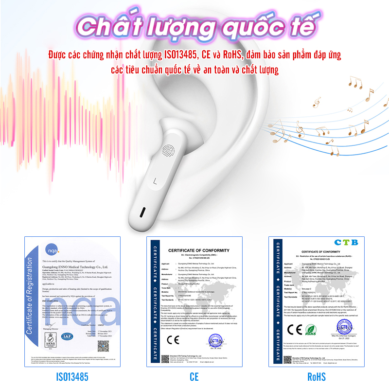 Sạc pin nhanh chóng và tiện lợi thông qua hộp sạc Ưu điểm của tai nghe trợ thính không dây Funmic EN-D18: Xử lý âm thanh bằng chip DSP Tai nghe trợ thính Funmic EN-D18 sử dụng chip DSP (Digital Signal Processing) để xử lý âm thanh, giúp tái tạo âm thanh tự nhiên và chân thực. Công nghệ này giúp giảm thiểu độ méo tiếng của âm thanh xuống mức 5%, mang lại cảm giác nghe gần như thật. Đây là yếu tố quan trọng đối với người sử dụng máy trợ thính, giúp họ không bị cảm giác "giả tạo" khi nghe qua thiết bị. Âm thanh to rõ, trong trẻo dễ nghe Sản phẩm có khả năng xử lý hiệu quả các tạp âm với mức giảm nhiễu lên đến 32dB, giúp người dùng nghe rõ hơn trong môi trường ồn ào. Đặc biệt, tai nghe khuếch đại âm thanh đến 117dB, giúp người nghe rõ ràng ngay cả những âm thanh nhỏ nhất. Người dùng có thể tùy chỉnh 5 mức âm thanh sao cho phù hợp với nhu cầu cá nhân và hoàn cảnh sử dụng. Hệ thống kênh âm thanh hiện đại Với thiết kế hiện đại, tần số âm thanh được chia thành 16 kênh khác nhau để nhận diện và xử lý âm thanh chi tiết hơn. Điều này giúp tai nghe trợ thính Funmic EN-D18 có khả năng phân tích và tái tạo âm thanh từ nhiều nguồn khác nhau một cách chính xác, giúp người dùng cảm nhận âm thanh rõ nét và tinh tế hơn. Thiết kế tinh tế, nhẹ nhàng và tiện lợi Máy trợ thính cao cấp Funmic EN-D18 được thiết kế dưới dạng tai nghe, không chỉ mang lại tính thẩm mỹ cao mà còn rất nhẹ nhàng, giúp giảm áp lực cho tai khi sử dụng trong thời gian dài. Người dùng sẽ cảm thấy thoải mái mà không lo bị đau tai hay khó chịu. Điều khiển cảm ứng siêu nhạy Với bảng điều khiển cảm ứng siêu nhạy, người dùng có thể thao tác dễ dàng chỉ bằng một cái chạm đơn giản. Thiết kế này giúp sản phẩm trở nên thân thiện và dễ sử dụng ngay cả đối với những người không quen với công nghệ hiện đại. Pin sạc nhanh, thời lượng pin ấn tượng Tai nghe trợ thính Funmic EN-D18 hỗ trợ sạc nhanh trong 2 giờ và có thể sử dụng liên tục lên đến 20 giờ sau mỗi lần sạc đầy. Thời gian sử dụng lâu dài giúp người dùng không cần lo lắng về việc sạc pin quá thường xuyên. Sản phẩm đi kèm với hộp sạc tiện lợi, giúp sạc nhanh chóng và dễ dàng bất cứ lúc nào, ở bất cứ đâu. Chứng nhận chất lượng quốc tế Máy trợ thính không dây Funmic EN-D18 đã đạt được các chứng nhận chất lượng ISO13485, CE và RoHS, đảm bảo sản phẩm đáp ứng các tiêu chuẩn quốc tế về an toàn và chất lượng. Điều này mang lại sự yên tâm tuyệt đối cho người sử dụng về tính an toàn và độ bền của sản phẩm. Đối tượng nào nên dùng máy trợ thính?