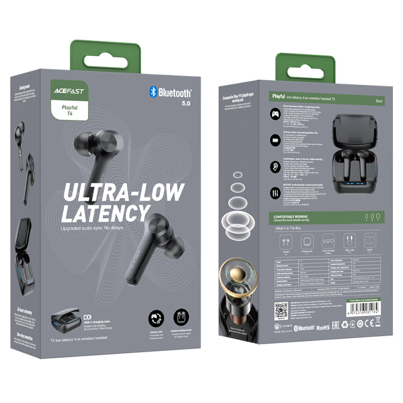 Tai nghe True Wireless ACEFAST - T4 chất lượng âm thanh vượt trội, độ trễ thấp. - Độ trễ cực thấp 65ms - Đồng bộ video và âm thanh nhanh hơn 3 lần - Cổng
