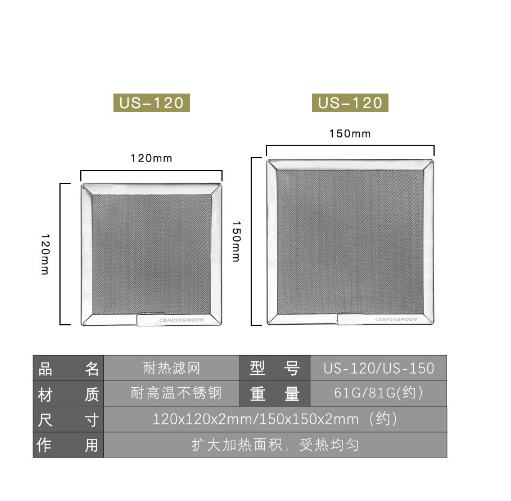 MÔ TẢ SẢN PHẨM TẤM LƯỚI TỤ NHIỆT CAMPINGMOON US-120/US-150 * THÔNG TIN SẢN PHẨM - Thương hiệu: Campingmoon - Mã sản phẩm: US-120/US-150 - Chất liệu: Thép không gỉ - Kích thước & Trọng