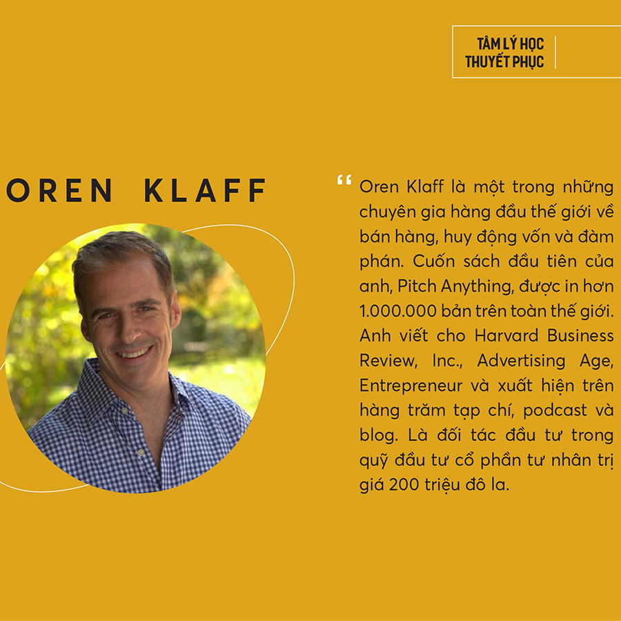 Oren Klaff là một trong những chuyên gia hàng đầu thế giới về bán hàng, huy động vốn và đàm phán. Cuốn sách đầu tiên của anh, Pitch Anything, được in hơn 1.000.000 bản trên toàn thế giới. Anh viết cho Harvard Business Review, Inc., Advertising Age, Entrepreneur và xuất hiện trên hàng trăm tạp chí, podcast và blog. Là đối tác đầu tư trong quỹ đầu tư cổ phần tư nhân trị giá 200 triệu đô la.