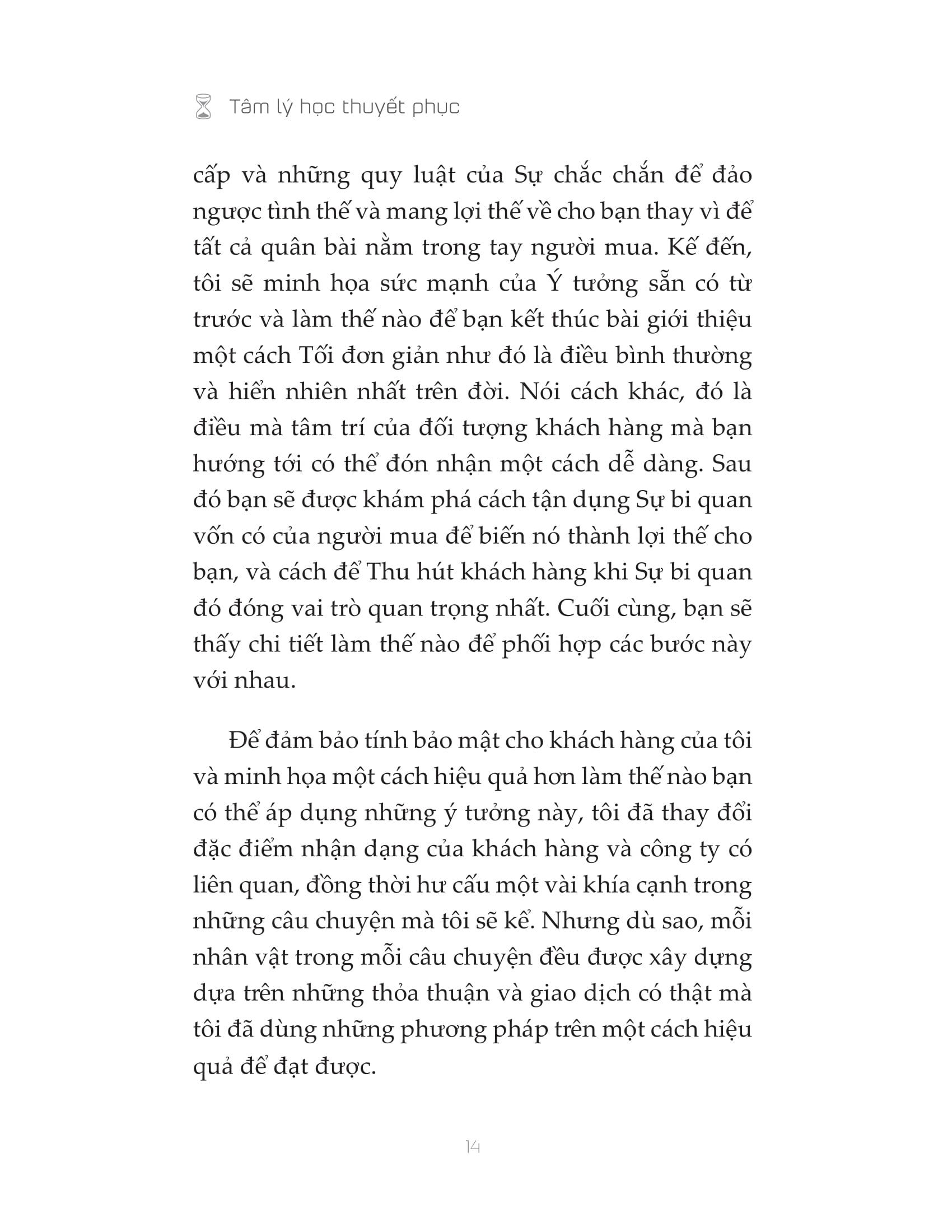 “Ngày nay, sản phẩm không phải để bán, mà là để mua.” Hoạt động bán hàng biến đổi hằng ngày và cách thức người mua thực hiện giao dịch cũng đang thay đổi cách thức người bán thực hiện chào hàng. Thay vì thúc ép dẫn đến kháng cự, cách hiệu quả hơn để chinh phục người mua là khiến họ bị thuyết phục và tự nguyện chi tiền. “Tâm lý học thuyết phục” cung cấp cho bạn phương pháp bán hàng hoàn toàn mới, không chèo kéo, không gây áp lực, giúp bạn có thể bán bất kỳ thứ gì cho bất kỳ ai.