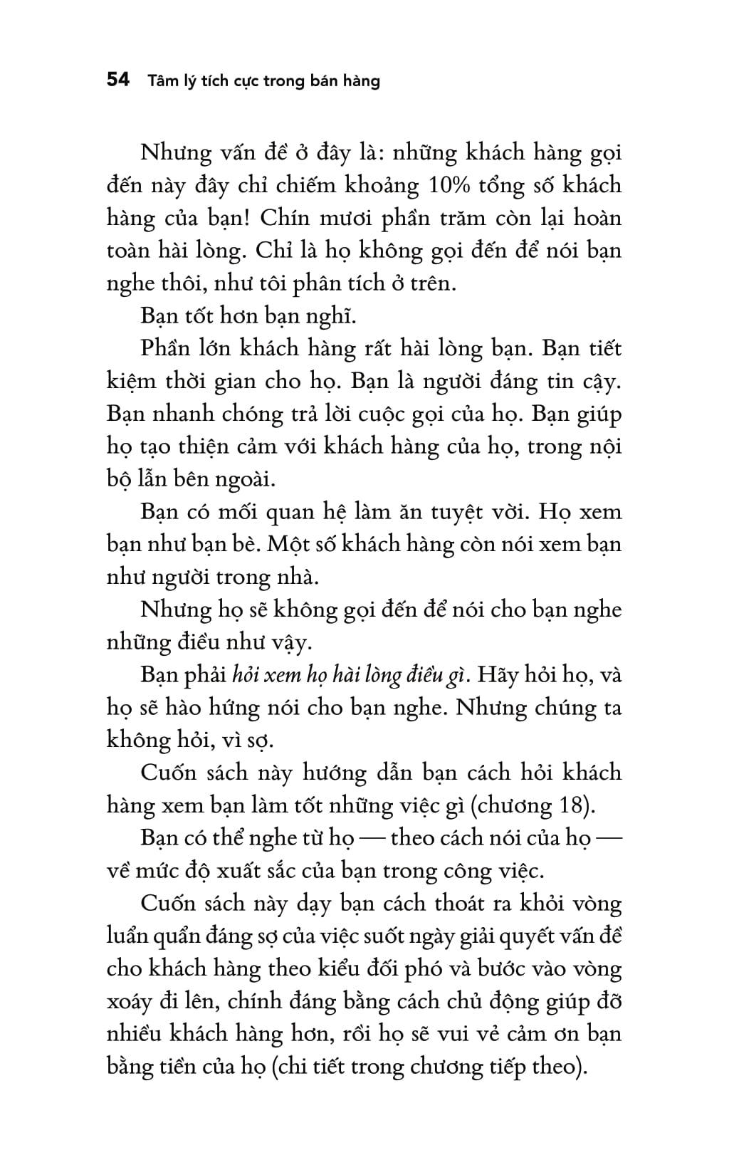 Bạn sẽ học được đúng cách vượt qua nỗi sợ hãi — sát thủ “diệt” doanh số — và thay bằng sự tự tin, lạc quan, lòng biết ơn, niềm vui và chủ động trong công việc bán hàng. Đây là cuốn sách đầu tiên vận dụng tâm lý học tích cực để biến đổi cách chúng ta làm việc giúp bạn bán được nhiều hơn.