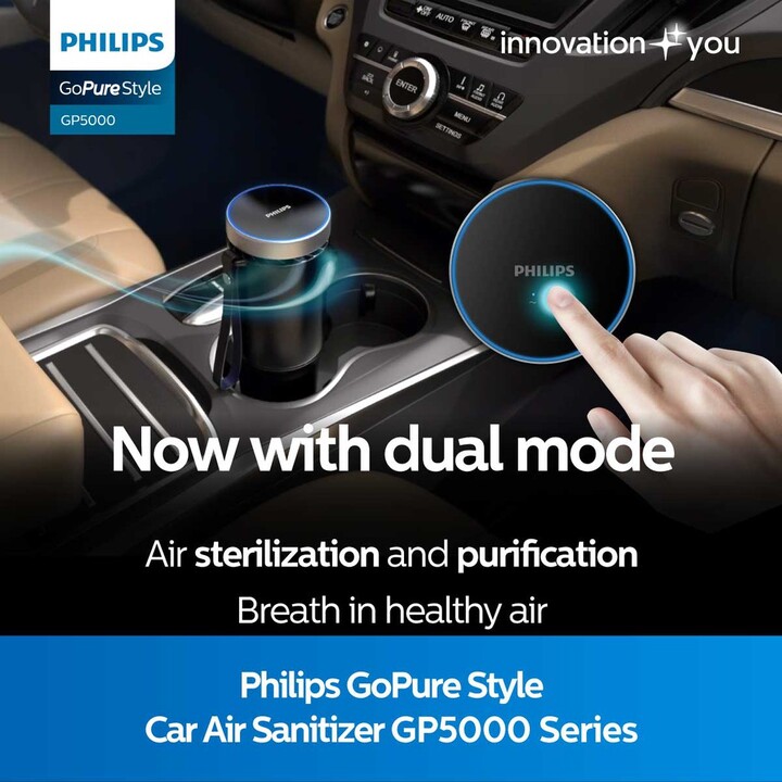 Máy khử mùi, lọc không khí dạng cốc trên xe ô tô cao cấp Philips GP5601 công suất 5,5W tích hợp 5 công nghệ tiên tiến bảo vệ không khí trong xe Philips là tên