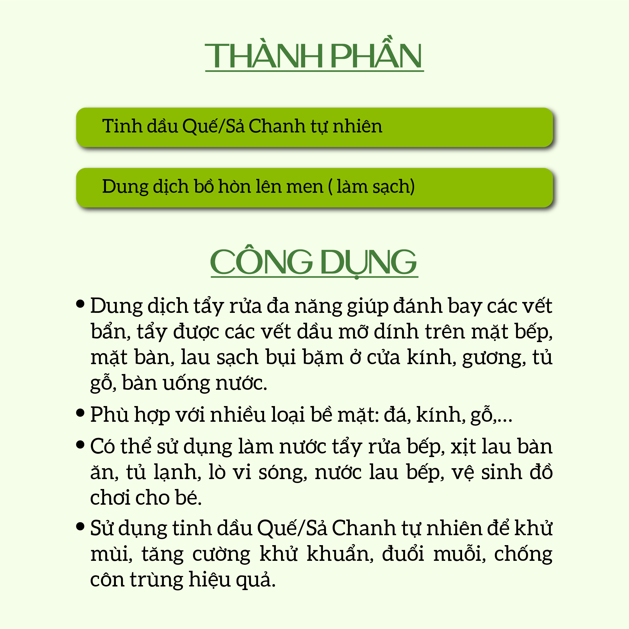– Nước xịt lau bàn ăn Bồ hòn hữu cơ với thành phần 100% tự nhiên, nguồn gốc thực vật. – Sử dụng tinh dầu thiên nhiên Quế để khử mùi, tăng cường