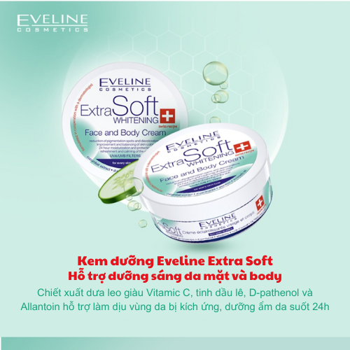 - Kem dưỡng Eveline Extrasoft giúp trắng da vùng mặt và toàn thân giúp làm mờ các vết nám, tàn nhang, cân bằng sắc tố da. Chiết xuất dưa leo giàu Vitamin C và axit hữu cơ làm sáng các vùng da sạm, làm mềm và tăng cường độ săn chắc, đàn hồi của da.