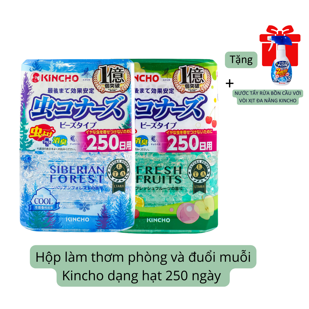 Hộp làm thơm phòng và đuổi muỗi Kincho dạng hạt 250 ngày (Hương trái cây, Hương hoa rừng Siberian) giúp xua đuổi muỗi và các loại côn trùng gây hại bằng chiết xuất trà xanh và tinh dầu thực vật. Sản phẩm không chứa hóa chất diệt côn trùng có hại.