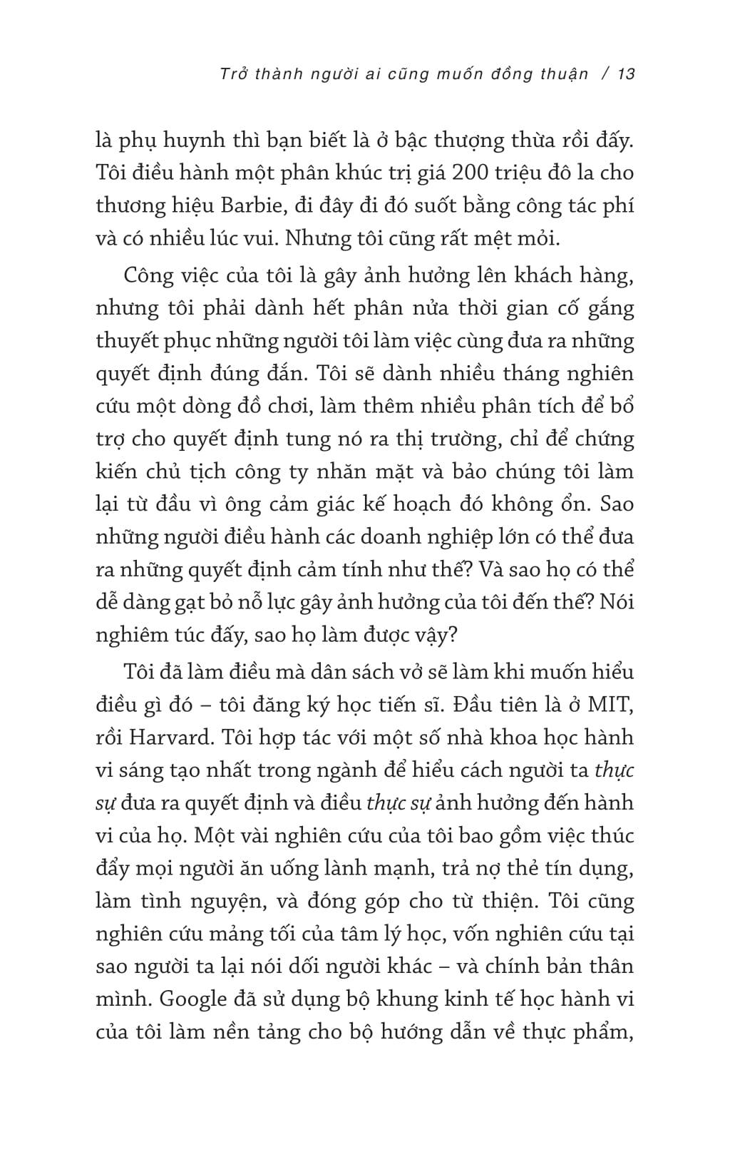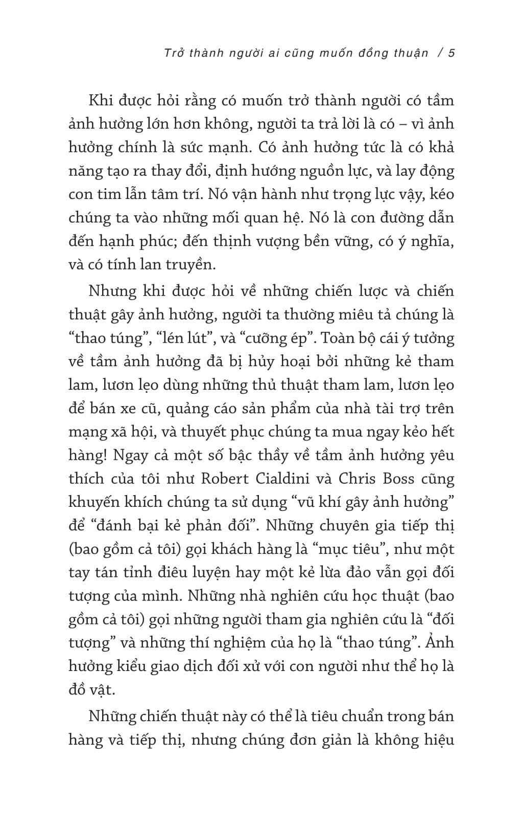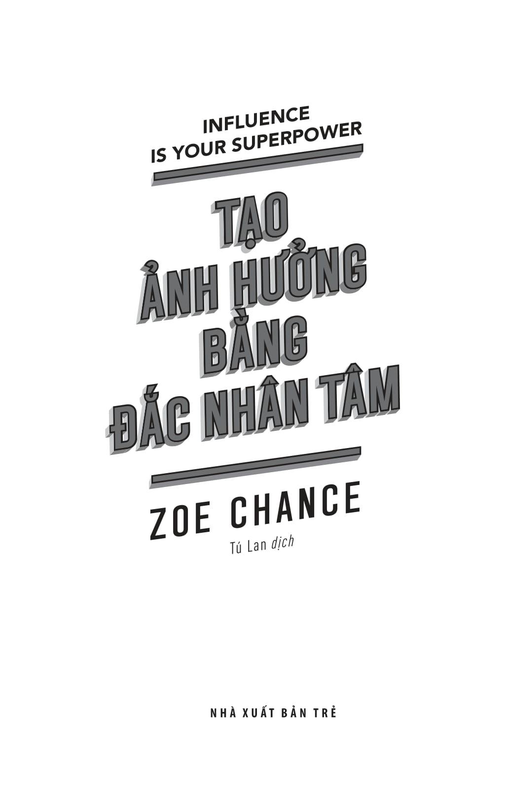 Tạo Ảnh Hưởng Bằng Đắc Nhân Tâm Ngay từ khi chào đời, bạn đã sở hữu một siêu năng lực: sức mạnh ảnh hưởng. Tuy nhiên, theo thời gian, bạn vô tình kìm hãm nó, tuân theo quy tắc, chờ đến lượt của m.ình và né tránh tạo ra sự khác biệt. Cuốn sách này sẽ giúp bạn thức tỉnh siêu năng lực ấy, biến bạn thành người khiến người khác luôn muốn nói lời đồng ý. Sức ảnh hưởng không vận hành theo cách bạn nghĩ bởi não bộ của chúng ta không hoạt động như bạn tưởng. Cuốn sách sẽ phân tích não bộ thành hai phần: Cá sấu và Thẩm phán, qua đó vạch trần những lầm tưởng phổ biến về ảnh hưởng, giúp bạn vượt qua những rào cản ban đầu và sẵn sàng yêu cầu điều m.ình muốn. Bạn cũng sẽ hiểu tại sao những chiến lược đàm phán quen thuộc lại có thể khiến bạn ít có ảnh hưởng hơn. Sách cũng sẽ tiết lộ các khung tâm lý học để thuyết phục người khác đồng ý với yêu cầu của bạn và tác động đến hành vi của họ. Bạn sẽ học cách trở nên quyến rũ hơn, đàm phán thoải mái và sáng tạo, cũng như phát hiện ra những kẻ thao túng thông qua các dấu hiệu cảnh báo dễ nhận biết. Trong hành trình đó, bạn cũng sẽ được gặp cá sấu, người nhảy dù, ảo thuật gia trong trang phục khỉ đột, Jennifer Lawrence, Thành Cát Tư Hãn và người đàn ông đã cứu thế giới bằng cách nói "không". Hãy sẵn sàng để biến đổi cuộc sống, nâng tầm tổ chức và thậm chí là thay đổi cả tiến trình lịch sử. Cuốn sách này sẽ đem đến cho bạn một phương pháp gây ảnh hưởng có đạo đức, giúp tạo nên cuộc sống tốt đẹp hơn cho tất cả mọi người, bắt đầu từ chính bạn.