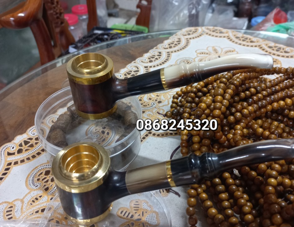 Tẩu hút xì gà gỗ trắc đỏ quý hiếm cán sừng mạ vàng 18K