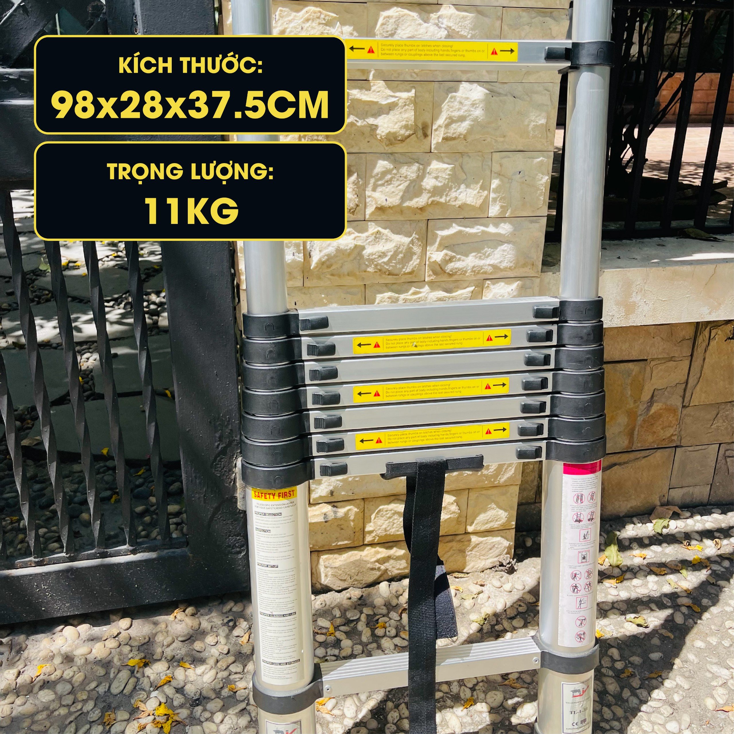 THÔNG SỐ KỸ THUẬT - Kích thước: 87x48x9 cm - Chiều cao tối đa: 3.8m - Chiều cao rút gọn: 0.81m - Số bậc: 13 bậc - Chất liệu: Hợp kim nhôm - Độ dày