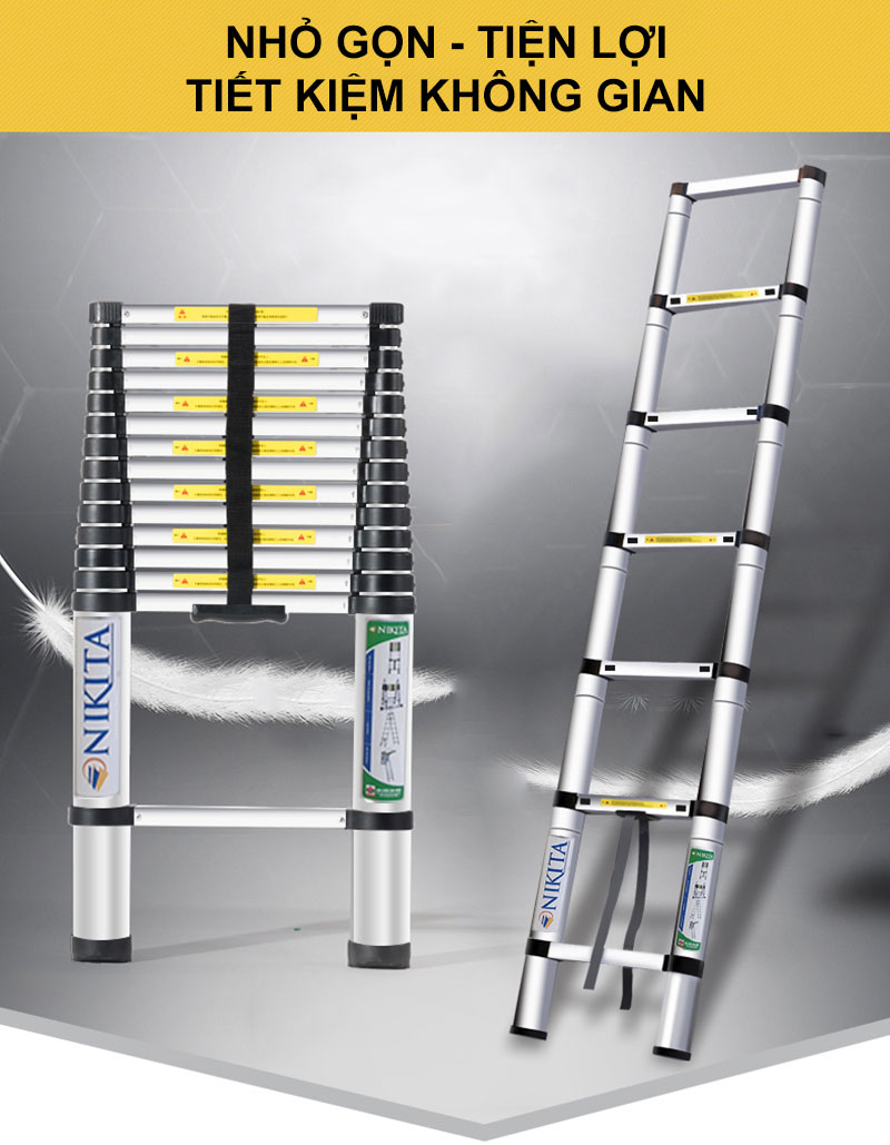 Thang nhôm rút gọn, an toàn, tiện dụng, đa năng - Nhôm 6063 không rỉ - Hàng chính hãng NIKITA Chất liệu : Nhôm + Plastic Màu sắc : Ống trắng + Đai nhựa
