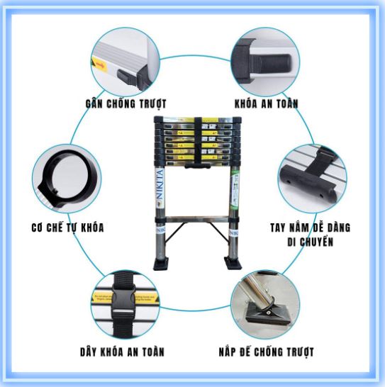 Thang nhôm rút gọn, an toàn, tiện dụng, đa năng - Nhôm 6063 không rỉ - Hàng chính hãng NIKITA Chất liệu : Nhôm + Plastic Màu sắc : Ống trắng + Đai nhựa
