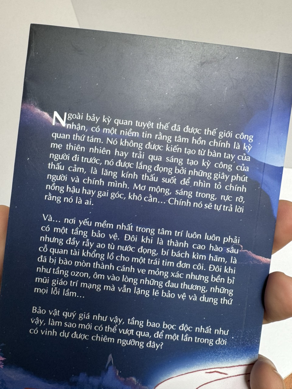 Ngoài 7 kỳ quan tuyệt thế đã được thế giới công nhận, có một niềm tin rằng tâm hồn chính là kỳ quan thứ 8. Nó không được kiến tạo từ bàn tay của mẹ thiên nhiên hay bàn tay lao động sáng tạo kỳ công của người đi trước, nó được lắng đọng bởi những giây phút thấu cảm, là lăng kính thấu suốt để nhìn tỏ chính người và chính mình. Nó mơ mộng, sáng trong, rực rỡ, nồng hậu hay gai góc, khô cằn… Chính nó sẽ tự trả lời rằng nó là ai.Khi cánh cửa sau lưng khép lại, ta từ chối giao tiếp với thực tại và thời gian, ta buông bỏ mảnh giáp che thân đã đầy vết trầy trụa xây xước, ta là ta, đối mặt với bản ngã. Ta nâng niu, chối bỏ, níu giữ, buông lơi… với những vết thương rỉ máu, những ký ức diệu vợi, những thù hận dai dẳng, những mơ mộng viển vông…