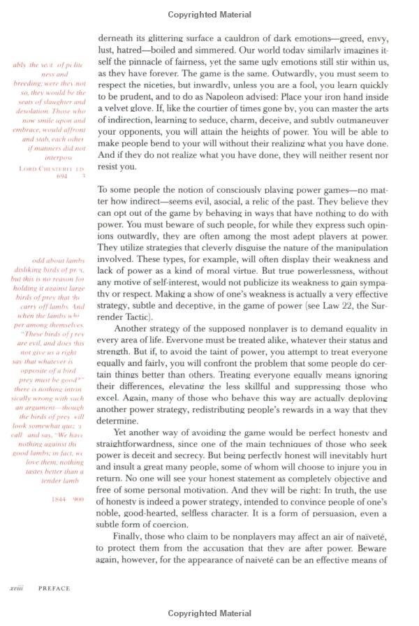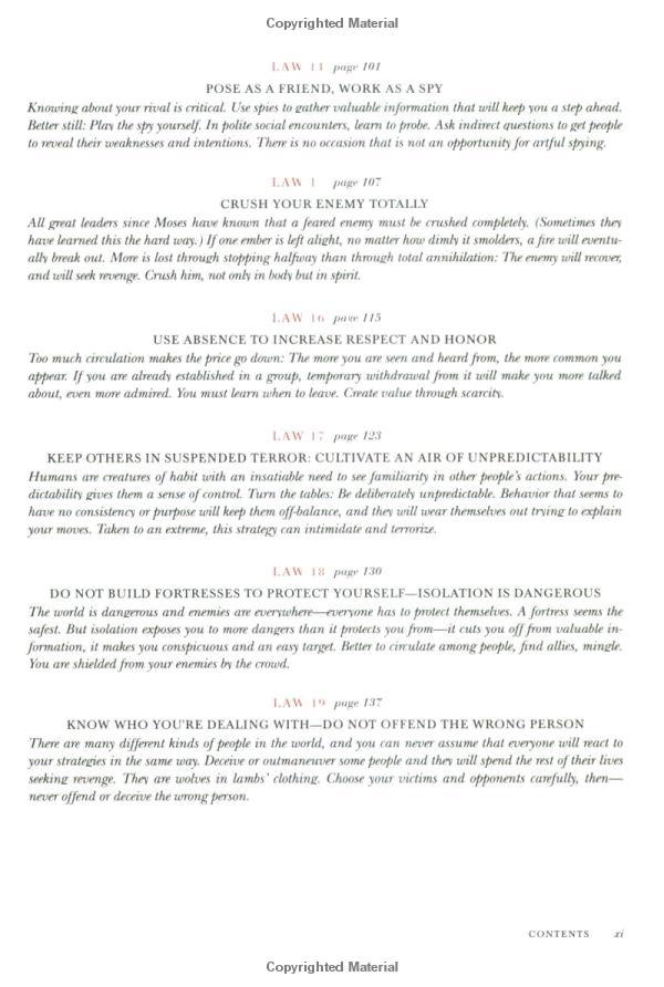 Amoral, cunning, ruthless, and instructive, this piercing work distills three thousand years of the history of power in to forty-eight well explicated laws. As attention-grabbing in its design as it is in its content, this bold volume outlines the laws of power in their unvarnished essence, synthesizing the philosophies of Machiavelli, Sun-tzu, Carl von Clausewitz, and other great thinkers.