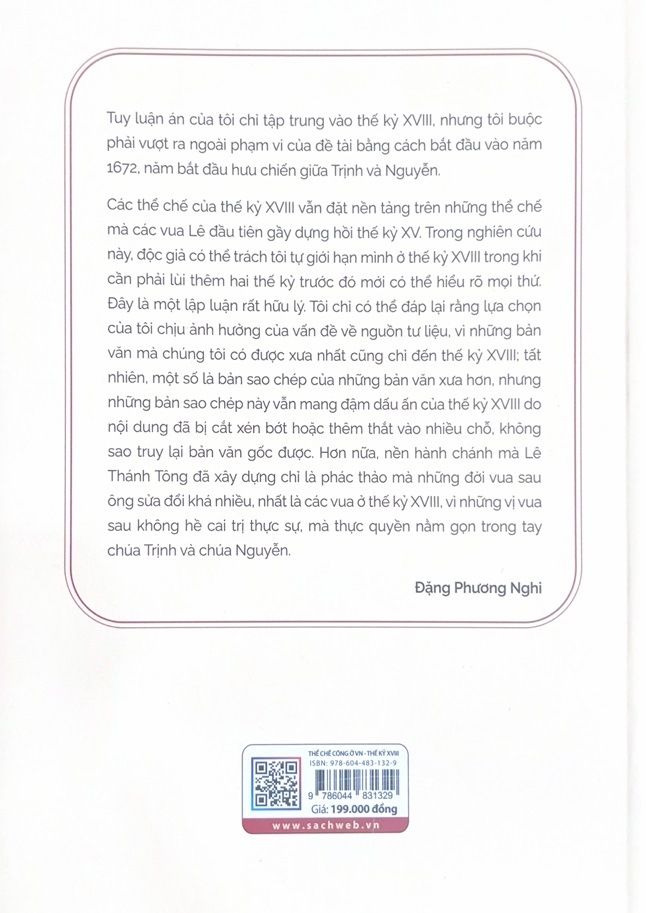 Kể từ khi được xuất bản lần đầu tiên bằng tiếng Pháp vào năm 1969, sách Thể chế công ở Việt Nam thế kỷ XVIII của Đặng Phương Nghi nhanh chóng trò thành tài liệu tham khảo không thể thiếu đối với các học giả nghiên cứu lịch sửViệt Nam (Đại Việt) trước khi nhà Nguyễn (1802-1945) ra đời. Sách này tổng hợp tài liệu từ nhiều nguồn trong nước (Hán Nôm, quốc ngữ) và châu Âu nhằm soi sáng tổ chức chính trị, quân sự từ trung ương đến địa phương (trấn, huyện, xã). Đây là công việc phức tạp vì vấn đề không phải là nghiên cứu một hệ thống chung mà là hai hệ thống ở hai lãnh thổ tự trị. Ở đây chúng tôi xin nhấn mạnh rằng nghiên cứu kết thúc với cuộc nổi dậy của Tây Sơn bởi vì, như tác giả viết, "Trong những năm nội chiến từ 1776 đến 1788, mọi thứ đều rồi bời, luật lệ chỉ còn trên giấy và công lý gần như biến mất"