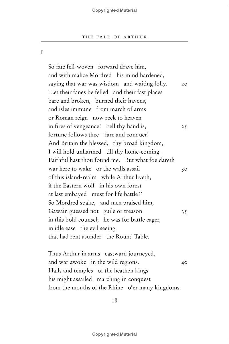 The Fall of Arthur, the only venture by J.R.R. Tolkien into the legends of Arthur King of Britain, may well be regarded as his finest and most skilful achievement in the use of the Old English alliterative metre, in which he brought to his transforming perceptions of the old narratives a pervasive sense of the grave and fateful nature of all that is told: of Arthur's expedition overseas into distant heathen lands, of Guinevere's flight from Camelot, of the great sea-battle on Arthur's return to Britain, in the portrait of the traitor Mordred, in the tormented doubts of Lancelot in his French castle.